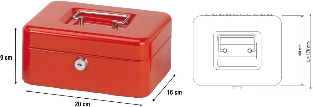 - Masse der MAUL Geldkassette (B x T x H): Das Aussenmass der Cash box beträgt 20 x 16 x 9 cm, das Innenmass der Geldkassette klein liegt bei 19,4 x 15 x 6 cm.