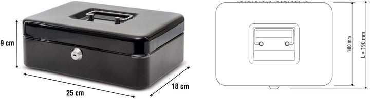 - Masse der MAUL Geldkassette (B x T x H): Das Aussenmass der Cash box beträgt 25 x 19 x 9 cm, das Innenmass der Geldkassette gross liegt bei 24,7 x 16,8 x 6 cm.