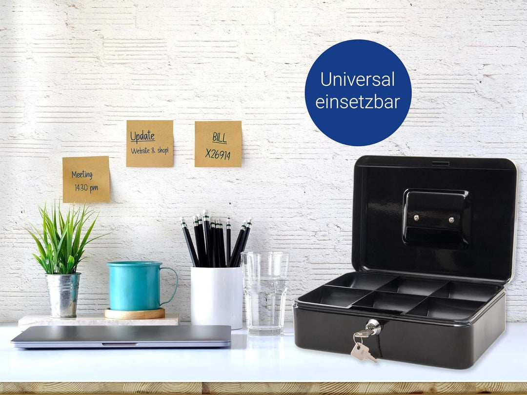 - Clever: Der herausnehmbare Hartgeldeinsatz mit sechs Fächern und das verdeckte Banknotenfach der Geldkassette bieten eine praktische Organisation. Nutzbar auch als Spardose mit Schlüssel und abschliessbare Box.