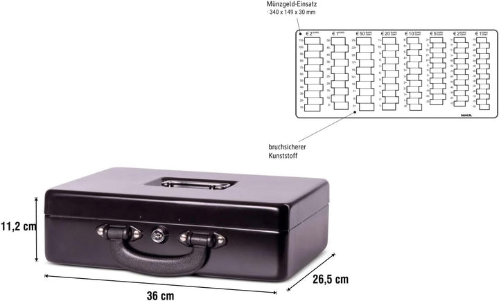 - Masse der Geldkassette: 36 x 26,5 x 11,2 cm.