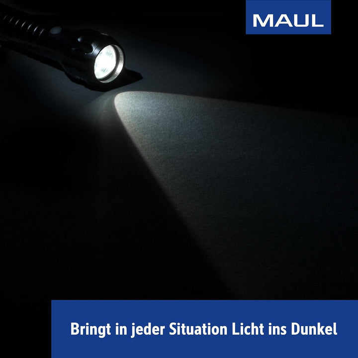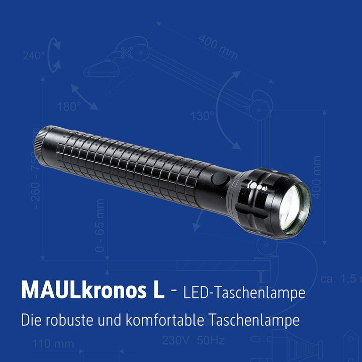 - Robust & komfortabel – Die MAUL LED-Taschenlampe MAULkronos L ist das zweitgrösste Modell der MAULkronos Serie und überzeugt mit einem komfortablen Design sowie einer hohen Qualität