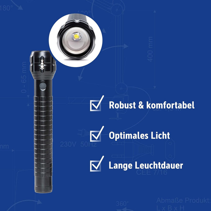 - Optimales Licht – Der stufenlos verstellbare Lichtkegel sowie der Lichtstrom von ca. 500 Lumen sorgen bei der Handlampe für optimales Licht bei einer Leuchtreichweite bis zu 280 Metern