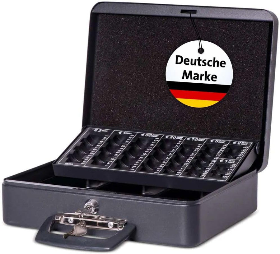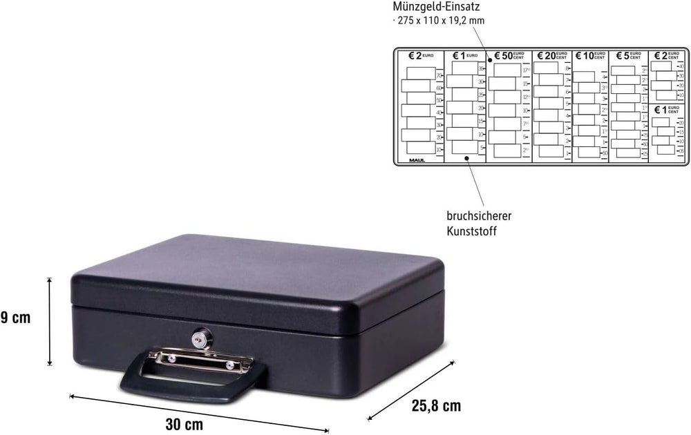 - Masse der Geldkassette: 30 x 25,8 x 9 cm.