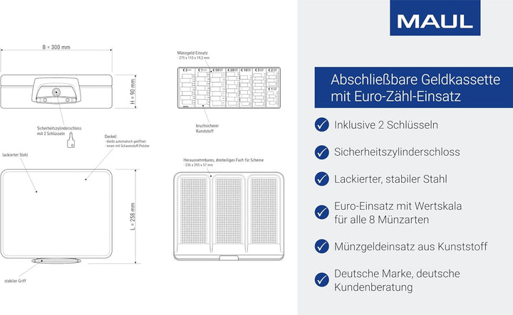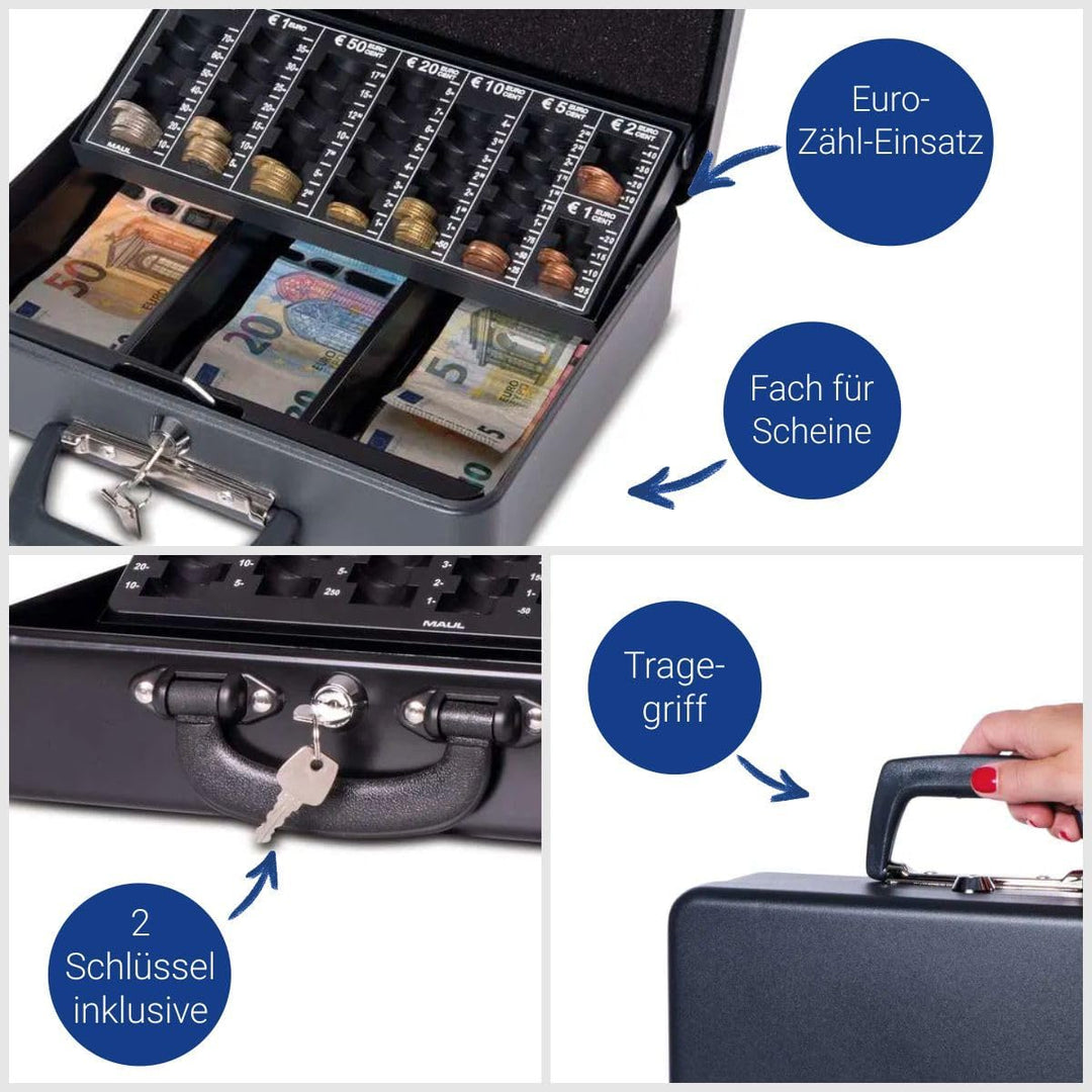 - Die Geldkassette ist aus nahtlos gezogenem, lackiertem Stahl gefertigt und mit einem praktischen Zähleinsatz ausgestattet.