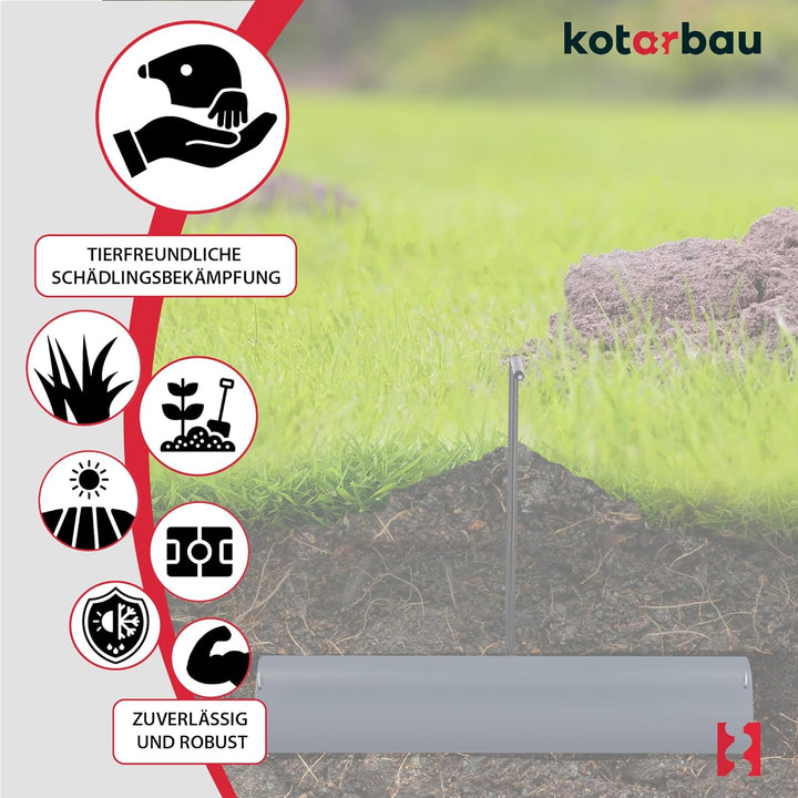 - FUNKTIONALITÄT – Die KOTARBAU Röhrenfalle ermöglicht es Ihnen, die Population von Wühlmäusen und Maulwürfen auf Ihrem Grundstück effektiv zu reduzieren. Sie sollte in einem Tunnel platziert werden, den die Nagetiere für die unterirdische