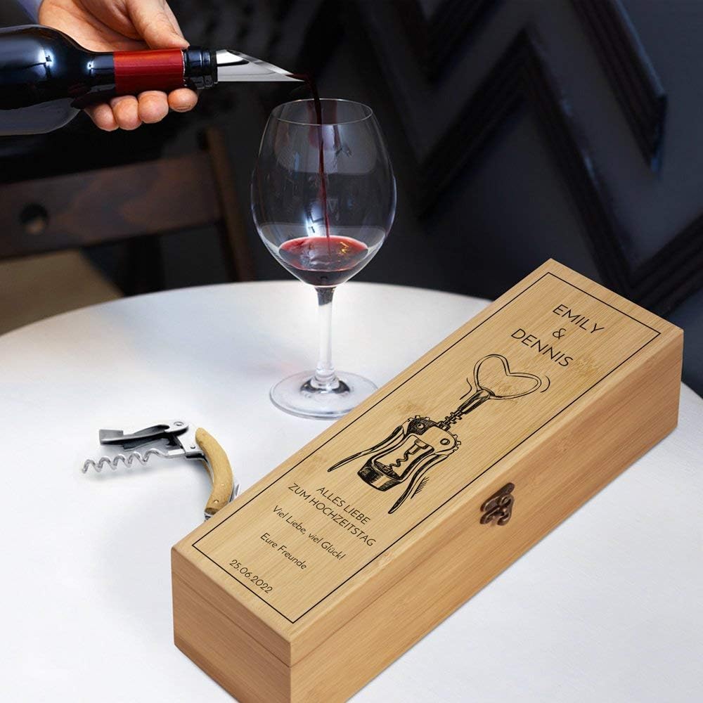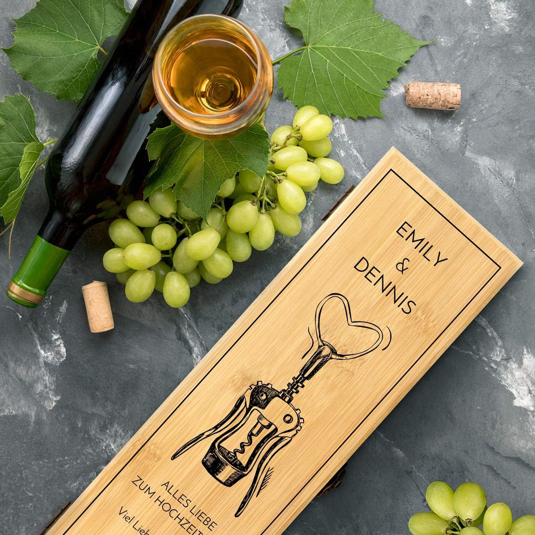 - SCHLICHTES DESIGN: Die Weinbox überzeugt mit schlichtem Design, der ansprechenden Ästhetik und der hochwertigen Verarbeitung. Die Maserung des Bambus hebt die schlichte Eleganz der Weinkoffer hervor und in Verbindung mit dem persönlichen Aufdruck wird