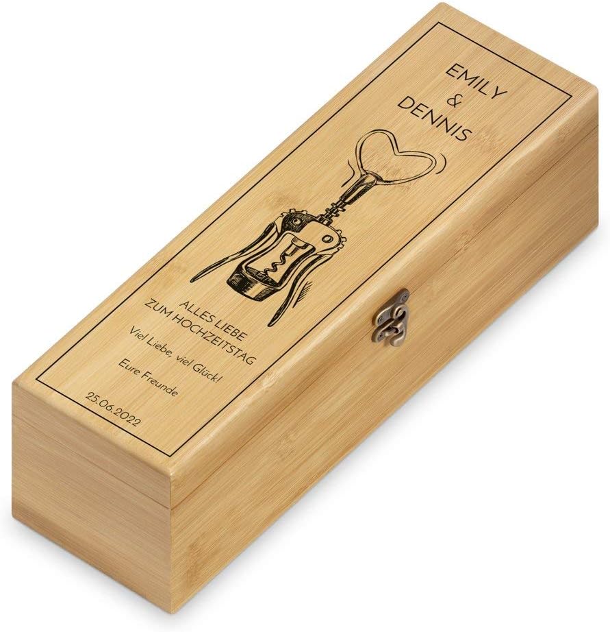 - STILVOLLES GESCHENKSET: die dekorative, rustikale Weinflaschen-Geschenkbox mit Platz für eine Flasche in gängiger Grösse mit 0,7 L Fassungsvermögen mit personalisiertem Aufdruck und dem schönen Öffnungs- und Schliessmechanismus. Die Weinkiste