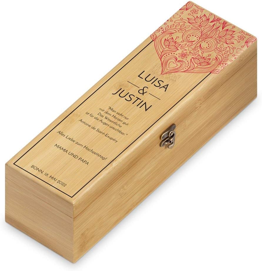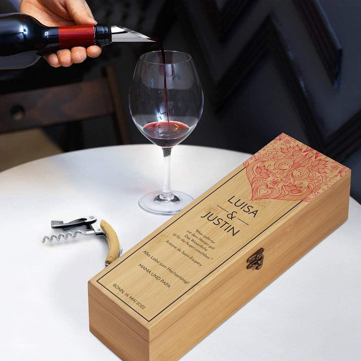 - STILVOLLES GESCHENKSET: die dekorative, rustikale Weinflaschen-Geschenkbox mit Platz für eine Flasche in gängiger Grösse mit 0,7 L Fassungsvermögen mit personalisiertem Aufdruck und dem schönen Öffnungs- und Schliessmechanismus. Die Weinkiste