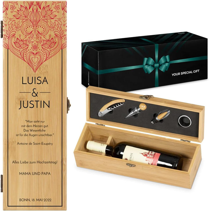 - GESCHENKIDEE FÜR PAARE: das Weinset ist eine grossartige Geschenkidee für die Eltern, Grosseltern, Brautpaar, Liebespaar oder Ehepaar - einfach für die echten Weingeniesser! Die personalisierbare, rustikale Weinkiste eignet sich ideal vor allem als