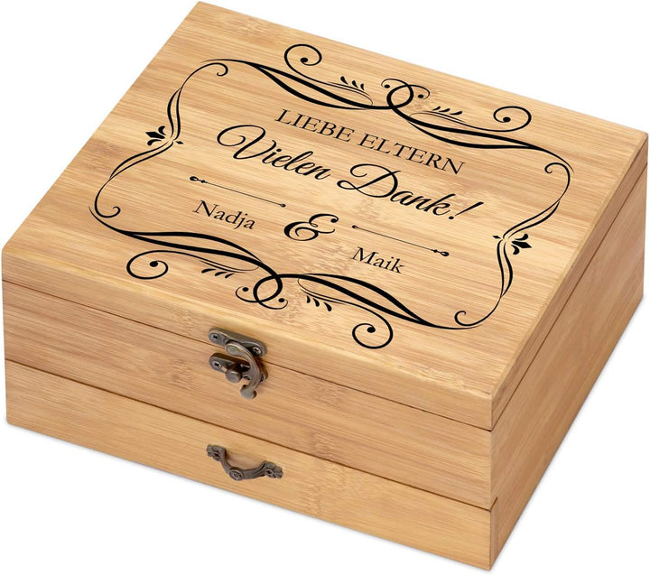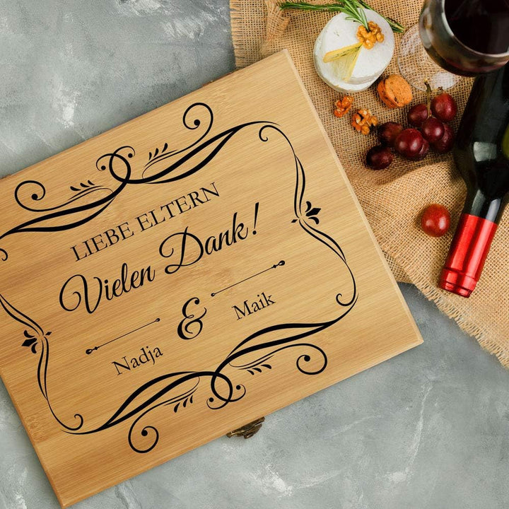 - SCHLICHTES DESIGN: Das Holzbox überzeugt mit schlichtem Design, der ansprechenden Ästhetik und der hochwertigen Verarbeitung. Die Maserung des Bambus hebt die schlichte Eleganz des Sets hervor und in Verbindung mit dem persönlichen Aufdruck wird es zu