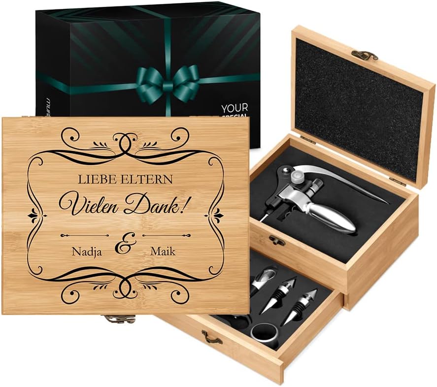 - GESCHENKIDEE FÜR PAARE: das Weinset ist eine grossartige Geschenkidee für das Brautpaar, für die Eltern, Grosseltern, Liebespaar oder Ehepaar - einfach für die echten Weingeniesser! Das personalisierbare, rustikale Weinöffner-Set eignet sich ideal