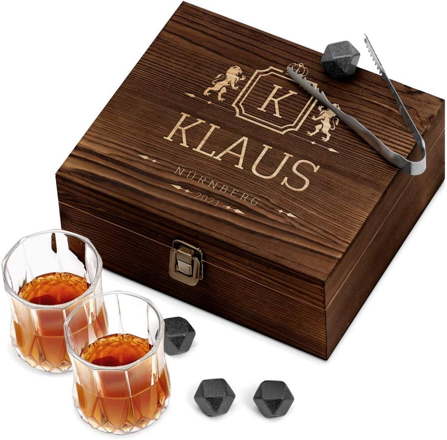 - 🎁 STILVOLLES GESCHENKSET: 8 wiederverwendbare Whiskysteine aus geschmacksneutralem, poliertem Granit mit einer Zange aus Edelstahl, einem schwarzen Velourbeutel + 2 Whiskygläser in einer gravierbaren, schliessbaren, hochwertigen Holzbox. Dank der