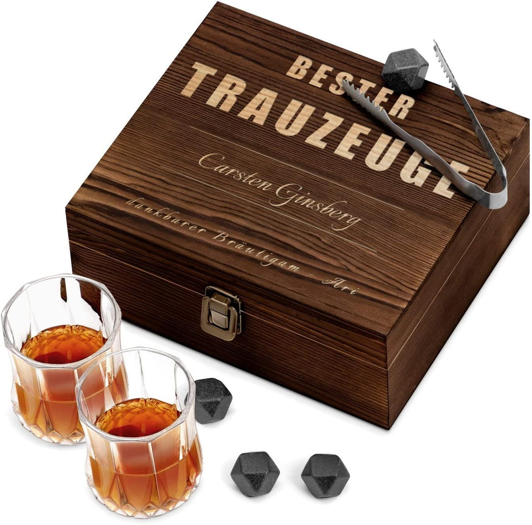 - 🎁 STILVOLLES GESCHENKSET: 8 wiederverwendbare Whiskysteine aus geschmacksneutralem, poliertem Granit mit einer Zange aus Edelstahl, einem schwarzen Velourbeutel + 2 Whiskygläser in einer gravierbaren, schliessbaren, hochwertigen Holzbox. Dank der