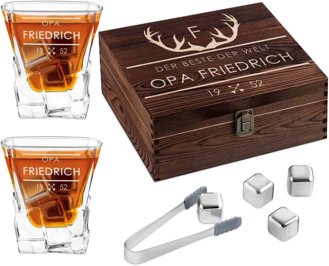 - 🔬 PROFESSIONELLE LASERGRAVUR: um dem Geschenkset einen individuellen Charakter zu verleihen, können Sie sowohl die Holzbox als auch die Whiskygläser mit Ihrem Wunschtext gravieren lassen. Für Ihren Individualisierungswunsch nutzen Sie bitte die