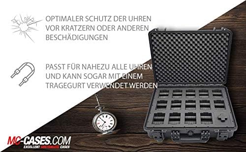 PRODUKTBESCHREIBUNGEN ⭐ Extrem sicherer Transportkoffer für bis zu 14 Uhren. Robust, Sicher, modulierbar, abschliessbar! Made Munich, Germany. 💡 Spezialschaumstoff: Das Innenleben des Koffers besteht aus hochwertigem, robustem und langlebigem Spezial-Formschaumstoff; ideal für empfindliche und filigrane Elemente! Ganz gleich ob Sie Uhren mit kurzem / langem Armband, grossem Gehäusering oder Uhren aus Materialien wie Edelstahl, Titan oder Goldlegierungen besitzen, die Uhren finden einen sicheren Platz im Koffer. Selbstverständlich entstehen keine Kratzer während des Transportes. ✔ Modulierbar für Ihre Bedürfnisse: Ein Uhrenfach kann alternativ als multifunktionelles Fach mit Deckel für Kleinteile, Zubehör, Putztücher o.Ä. genutzt werden. Ganz gleich ob Sie Uhren mit langem Armband, grossem Gehäusering oder Uhren aus Materialien wie Edelstahl, Titan oder Goldlegierungen besitzen, die Uhren finden einen sicheren Platz im Koffer. 🛡 Sicher: Extrem sicherer Transportkoffer für bis zu 14 Uhren. Ihre Uhren sind gegen äussere Einwirkungen (Wetter, Gewalt, Stoss, Sturz etc.) gesichert. Alle unsere Koffer sind nach IP67 geprüft und damit staub- und unterwasserdicht für bis zu 30 Minuten. Ein echtes Produkt „Made in Germany“ - Herstellung in Deutschland unter Berücksichtigung strenger Vorschriften für die schaumstoffverarbeitende Industrie 🔒 Abschliessbar: Der Koffer ist mittels TSA Schloss (nicht im Lieferumfang enthalten) über zwei Ösen abschliessbar. Perfekt zum Transport und Sichern von hochwertigen Uhren jeder Güteklasse. Markenprodukt by MC-CASES Gewicht: 2.9 Kg. Masse: 502 x 415 x H 141 mm. Deutsche Qualität, Deutscher Support. ☎