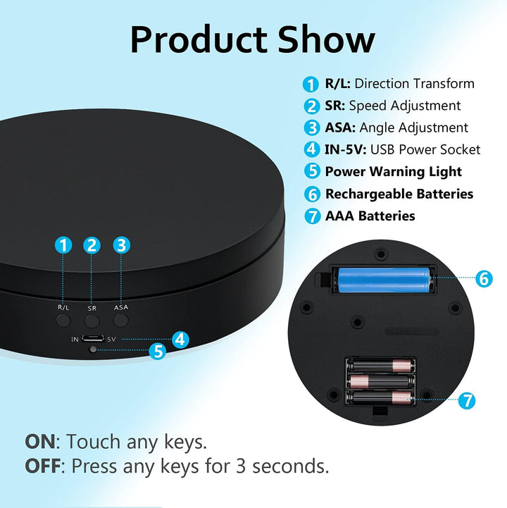- Der Drehteller hat einen Durchmesser von 13,8 cm und eine Höhe von 3,5 cm und dreht sich konstant und gleichmässig, wodurch ein grossartiger Effekt bei Videoaufnahmen und Produktvorführungen entsteht.Maximale Tragfähigkeit 3 kg.