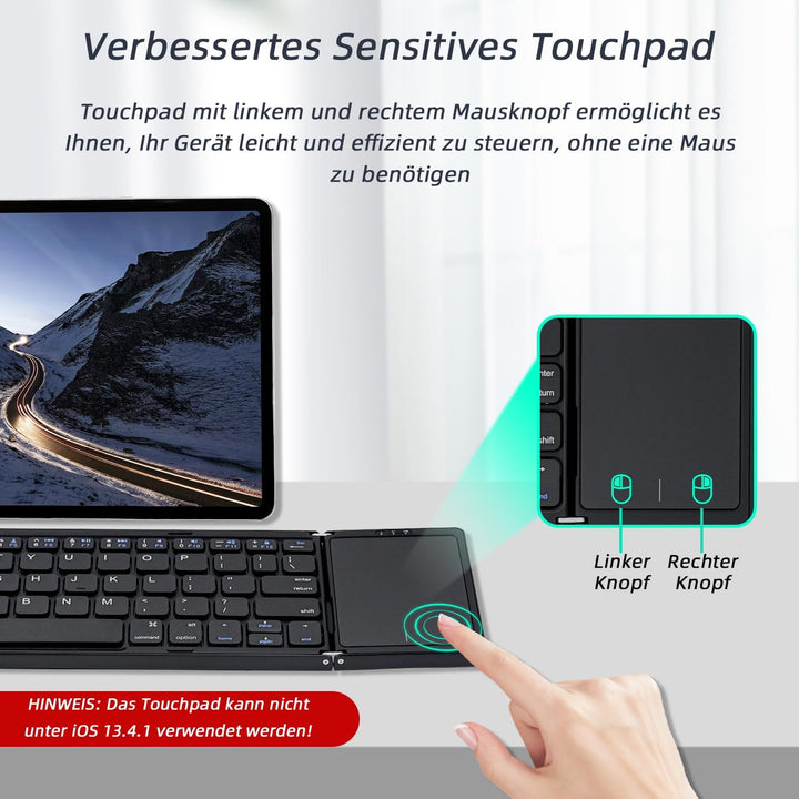 - Empfindliches Touchpad: Diese faltbare kabellose Tastatur wurde aufgerüstet und der Touchpad-Bereich unterstützt Multitouch, sodass Sie das Gerät ohne Maus steuern können, was bequemer und effizienter ist. Diese Touch-Tastatur ist kompatibel mit