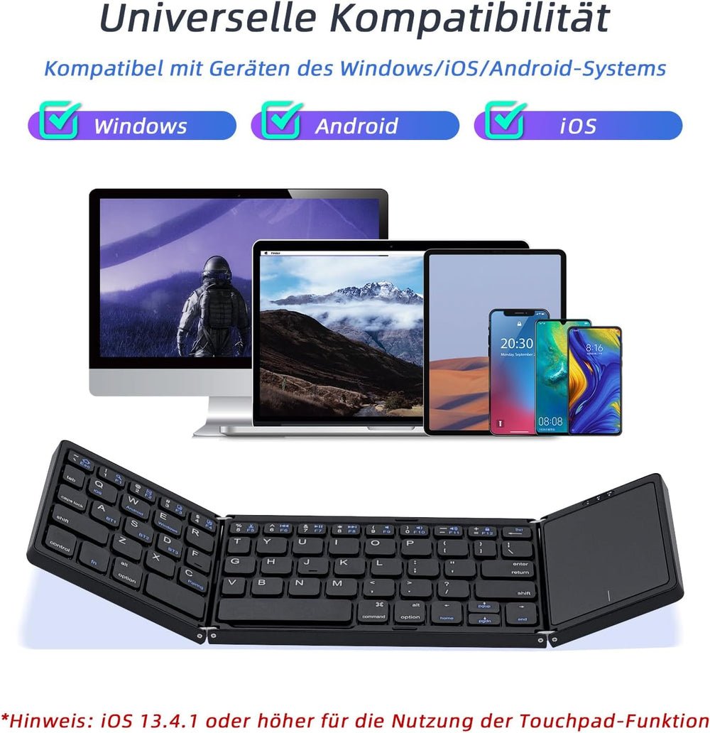 - Stabile Verbindung und erweiterte Kompatibilität: Die faltbare kabellose Tastatur kann bis zu 3 Geräte (iOS, Android 4.0 höher, MacOS und Windows) gleichzeitig innerhalb von 10 Metern verbinden. Wechseln Sie einfach zwischen mehreren Geräten. Es