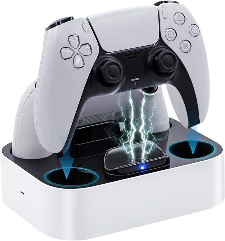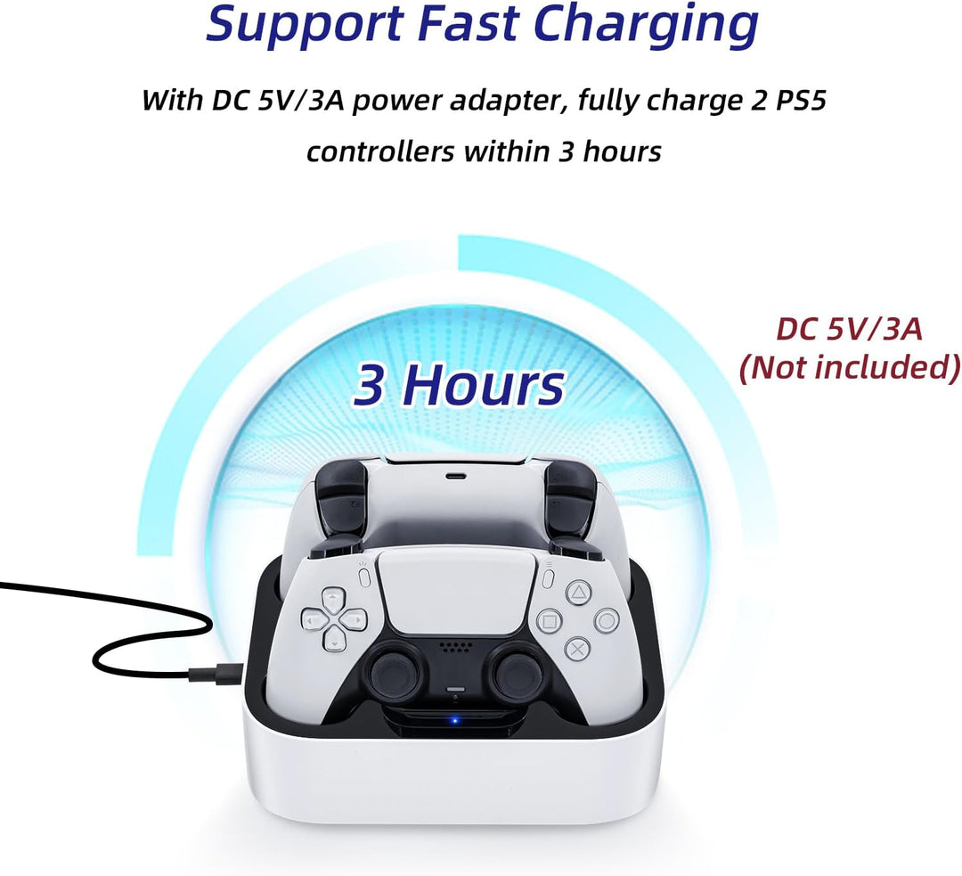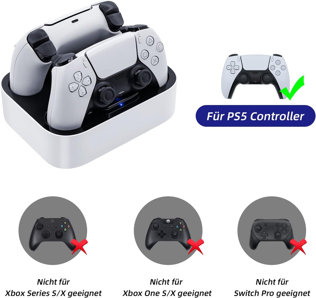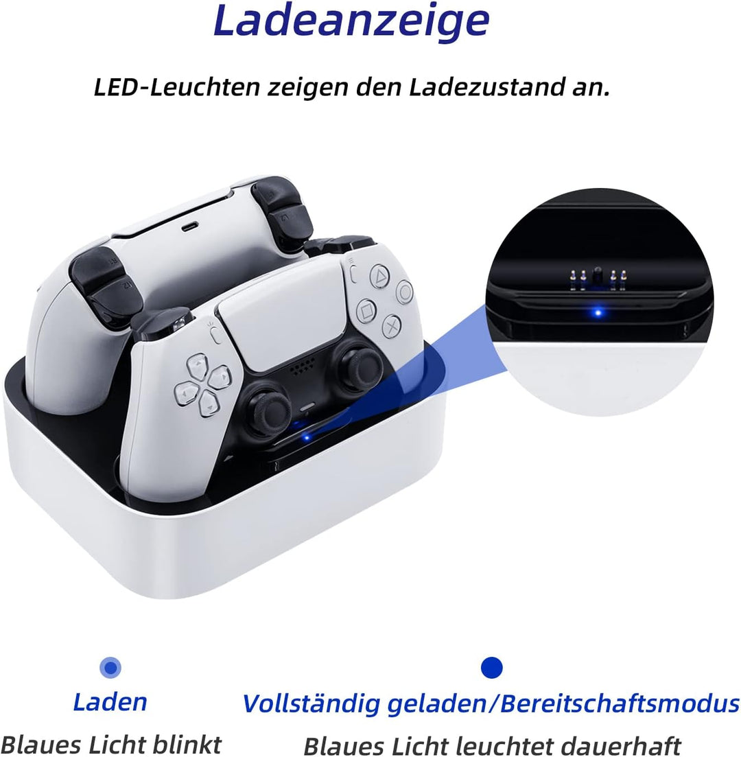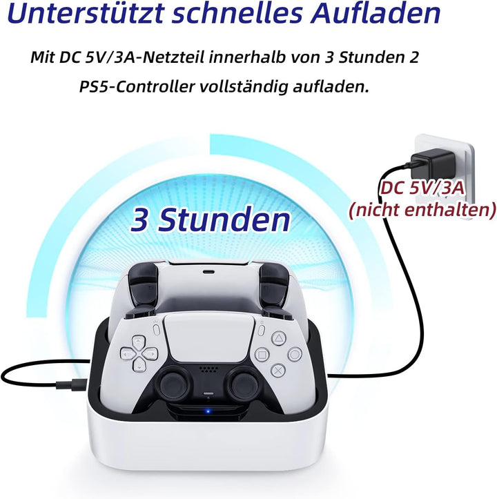 - 【Schnelles Laden】Diese PS5-Ladestation hat eine Ausgangsspannung von 5 V DC / 2,2 A (1,1 * 2), die Ihren PS5-Controller in nur 2-3 Stunden vollständig aufladen kann, bietet schnelles und effizientes Laden.