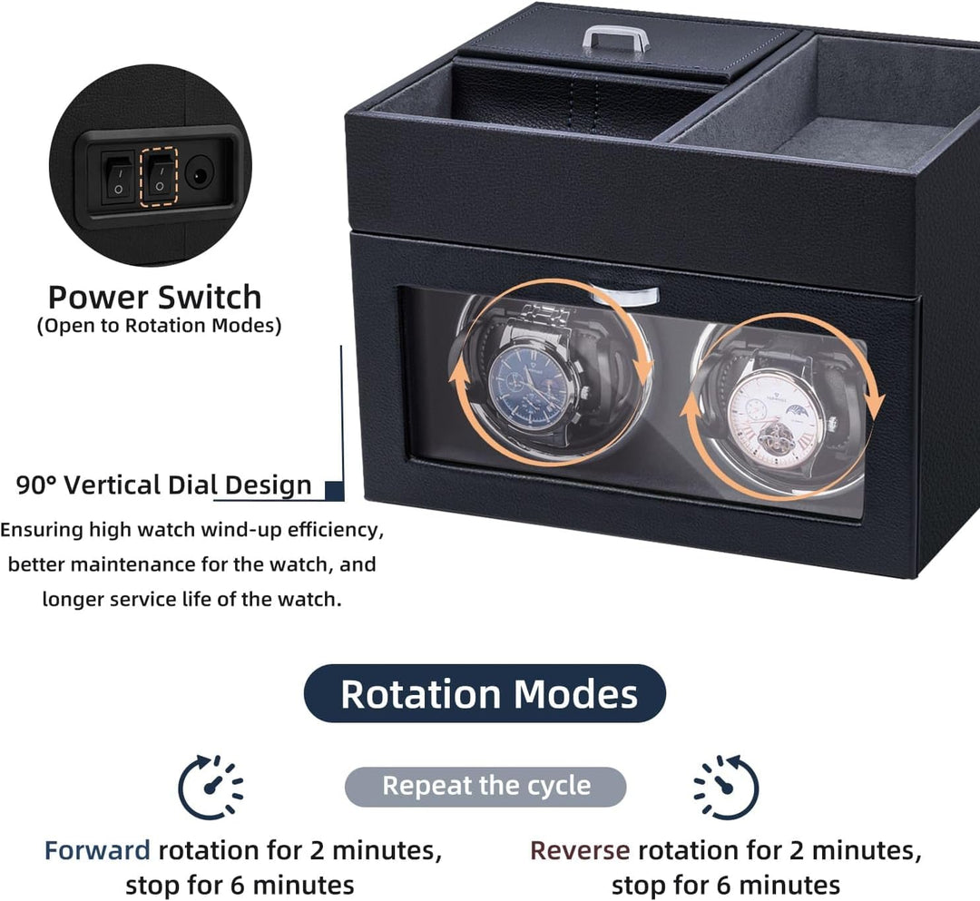 - Hohe Aufzieheffizienz: Der Uhrenbeweger für 2 Uhren ist mit einem japanischen leisen Mabuchi-Motor ausgestattet. Arbeitsmodus: 2 Minuten lang vorwärts drehen, 6 Minuten anhalten, 2 Minuten lang umdrehen, 6 Minuten anhalten und den Zyklus wiederholen.