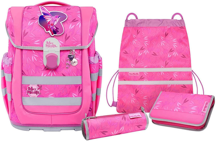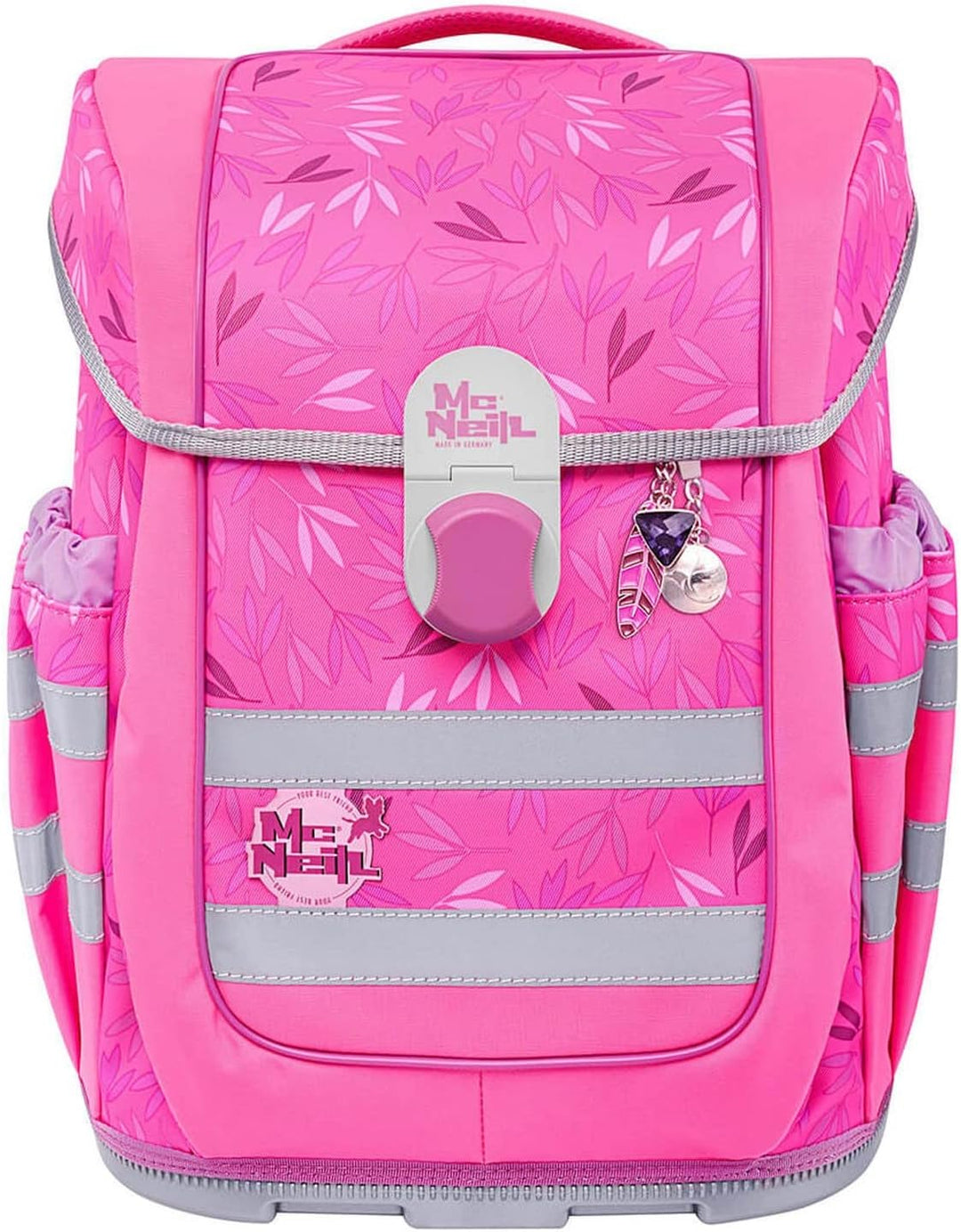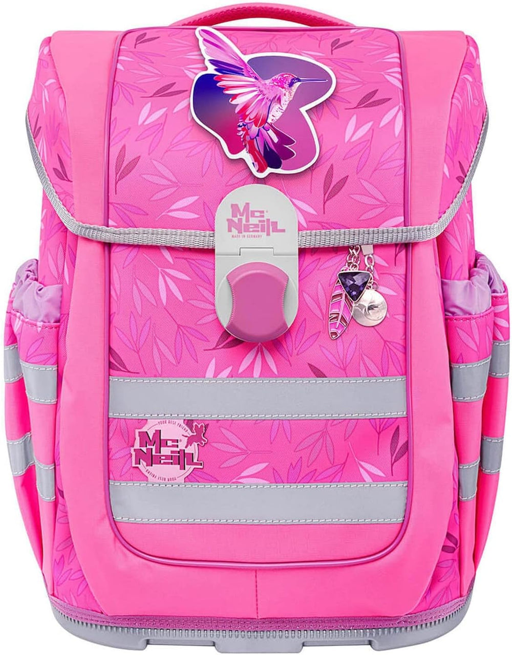 PRODUKTBESCHREIBUNGEN McNeill Schulranzen mit tollem Muster Lieferumfang McNeill Set: o Schulranzen (Schulranzen) mit Etikett, Stundenplan, Beckenflosse, McTaggie o Federmäppchen (Federmäppchen) mit Etikett und Stundenplan, Buntstift, Bleistift, Radiergummi, Spitzer, Geodreieck, Lineal o Schlampermäppchen (Schlampermäppchen) mit Etikett o Sportbeutel (Sportbeutel) mit Etikett o Schlüsselanhänger (Schlüsselanhänger) mit Etikett und Schlüsselring Daten Schulranzen: o Masse: Breite ca. 29 cm, Höhe ca. 38,5 cm, Tiefe ca. 22 cm o Gewicht: ca. 1490 g o Volumen: ca. 20 l o Farbe: Birdy (pink / flieder) o 1 Tragegriff gepolstert: ca. 15 cm o 1 Tragegriff verstärkt: ca. 15 cm o 2 Schultergurte ergonomisch geformt, atmungsaktiv, gepolstert, stufenlos verstellbar: ca. 35 cm - 70 cm o 1 Brustgurt, stufenlos verstellbar: ca. 15 cm - 35 cm o 1 Beckenflosse, abnehmbar, gepolstert: ca. 50 cm o 1 Hüftgurt stufenlos verstellbar: ca. 12 cm - 50 cm o Material: Polyester o Lieferumfang: McNeill Schulranzen mit Etikett, Stundenplan, Beckenflosse, McTaggie Ausstattung Schulranzen: o Schulranzen wird mit Überschlagklappe und Magnetverschluss geschlossen o Im Hauptfach 1 Einschubfach o Auf der Oberseite 1 Magnetbefestigung für McTaggie o Auf der Innenseite des Deckels 1 Sichtfach für Stundenpläne o Auf der Vorderseite 2 aufgesetzte Einschubfächer, in dem sich 1 Einschubfach, 1 Schlüsselfinder und 2 Befestigungsschlaufen für Anhänger befindet o Auf der rechten und linken Seite 1 elastisches Einschubfach für Trinkflaschen oder Regenschirme und 1 Auslauföse o Auf der Rückseite 2 Haken für Sportbeutel o Rückseite ist ergonomisch geformt und gepolstert o Mit höhenverstellbarem Brustgurt, Lastenkontrollriemen an den Schul