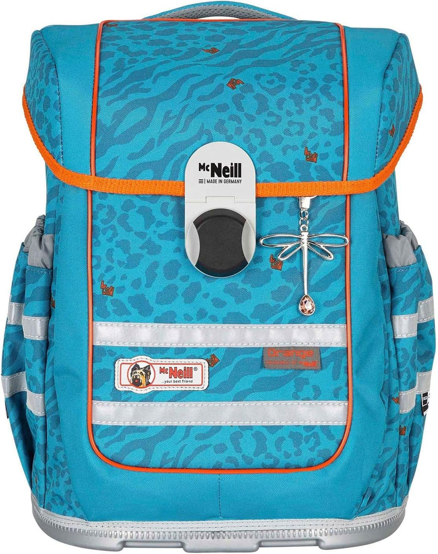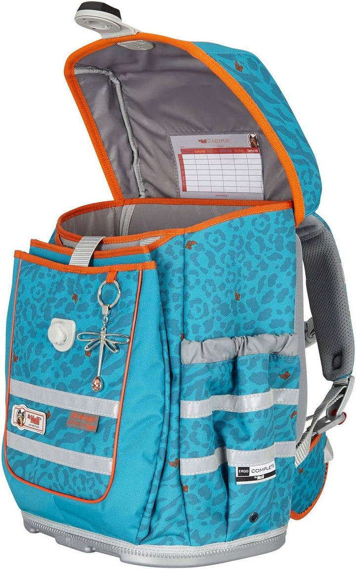 PRODUKTBESCHREIBUNGEN McNeill Schulranzen mit tollem Muster Daten Schulranzen: o Masse: Breite ca. 30 cm, Höhe ca. 40 cm, Tiefe ca. 22 cm o Gewicht: ca. 1540 g o Volumen: ca. 20 l o Farbe: Orange (Türkis / Orange) o 1 Tragegriff gepolstert: ca. 15 cm o 2 Schultergurte ergonomisch geformt, atmungsaktiv, gepolstert, stufenlos verstellbar: ca. 41 cm - 68 cm o 1 Brustgurt, stufenlos verstellbar: ca. 11 cm - 28 cm o 1 Beckenflosse, abnehmbar, gepolstert, stufenlos verstellbar: ca. 35 cm - 68 cm o Material: Polyester o Lieferumfang: McNeill Schulranzen mit Etikett, Stundenplan, Beckenflosse, McTaggie, Anhänger Ausstattung Schulranzen: o Schulranzen wird mit Überschlagklappe und Schnappverschluss geschlossen o Im Hauptfach 1 Einschubfach o Auf der Überschlagklappe 1 Sichtfach für Stundenpläne o Auf der Vorderseite 1 aufgesetztes Einschubfach, in dem sich 2 Einschubfächer und 1 Schlüsselfinder befinden o Auf der rechten und linken Seite 1 elastisches Einschubfach für Trinkflaschen oder Regenschirme o Rückseite ist ergonomisch geformt und gepolstert o Mit Brustgurt an den Schultergurten, Lastenkontrollriemen an den Schultergurten, höhenverstellbarem Tragegurtsystem ausgestattet o Mit verstärktem Boden und Schutzfüsschen ausgestattet o Ist reflektierend o Besitzt flexible Rückenlängenanpassung o Ist gross genug für DIN A4 o Das McNeill Logo ist gut sichtbar eingearbeitet McNeill Ergo Complete Schoolbag - Der Schulranzen, der leuchtet Mit diesem Schulranzen von McNeill ist Ihr Kind für alle Situationen bestens vorbereitet! Im geräumigen Hauptfach bringen Sie alle Hefte und Bücher geordnet unter. Zudem ist noch ausreichend Platz für, Vesperdose und Trinkflasche. Die Rückseite des McNeill Ergo Complete Schoolbag ist gepolstert