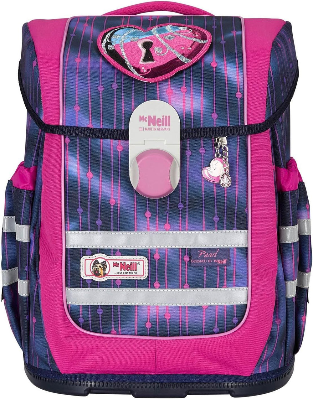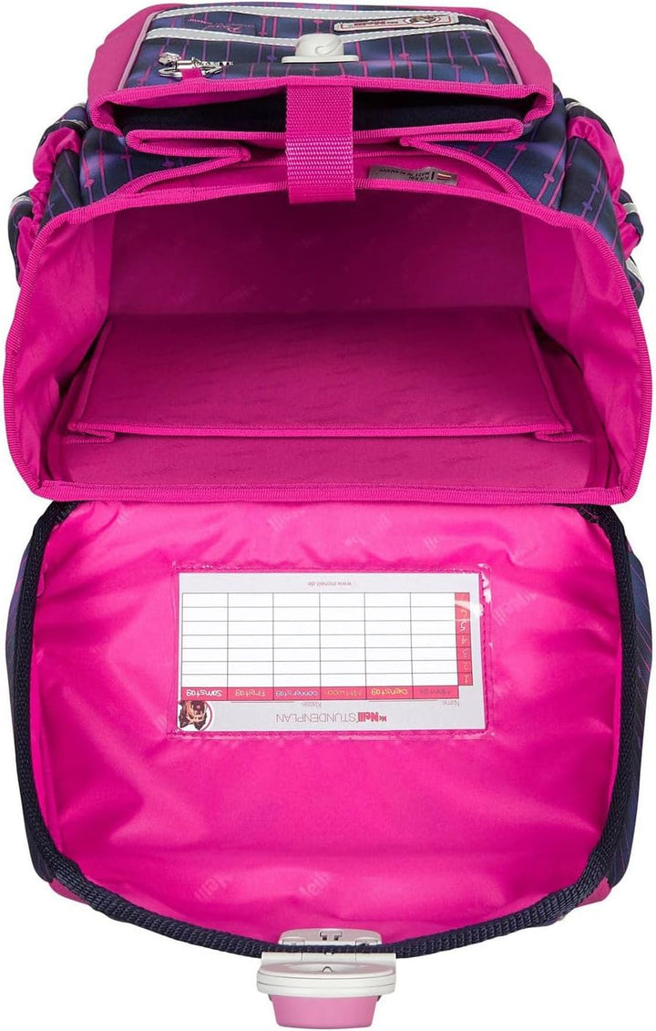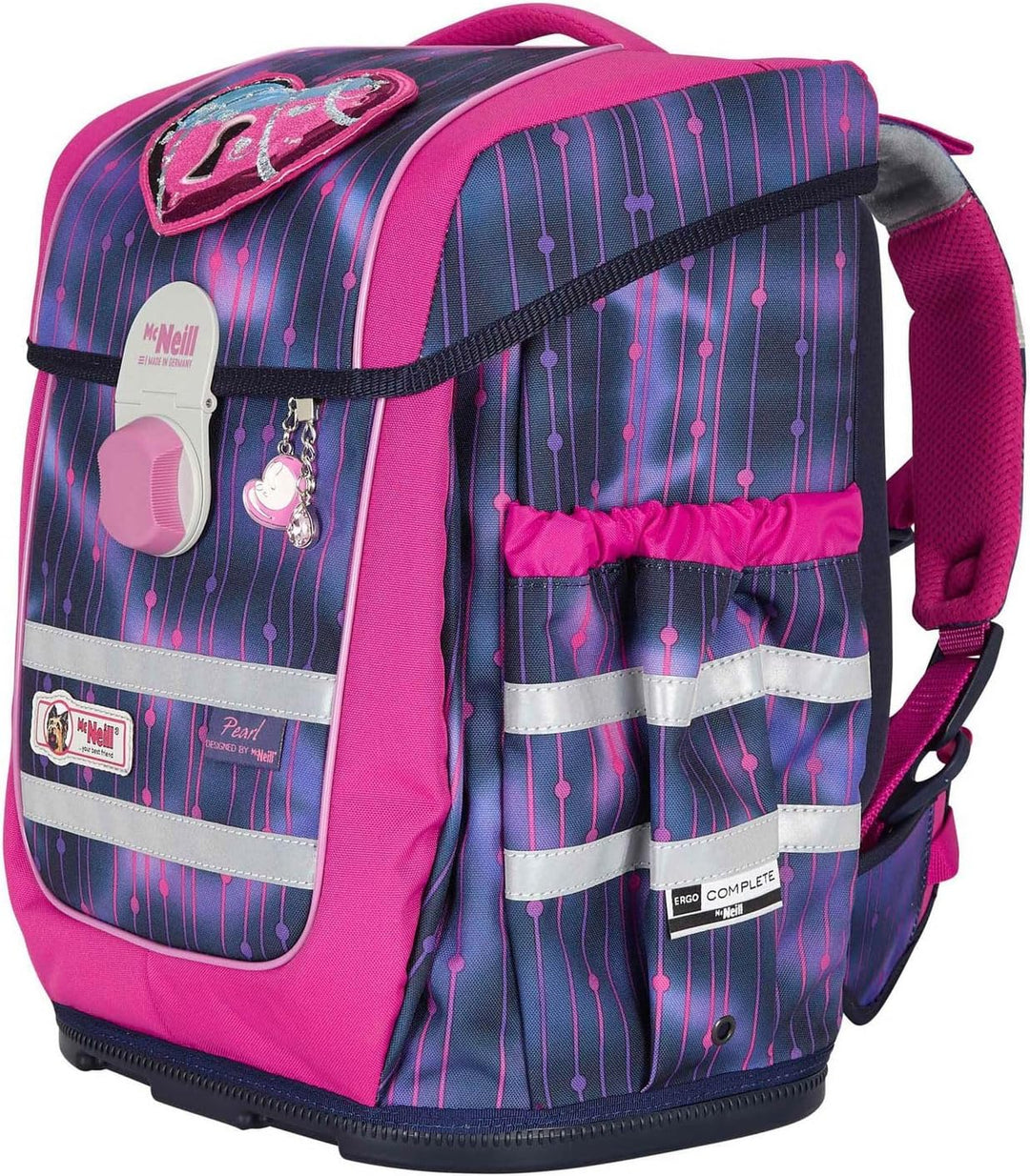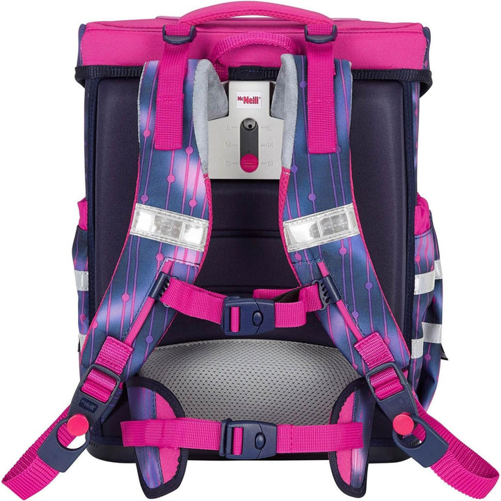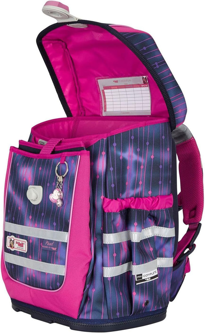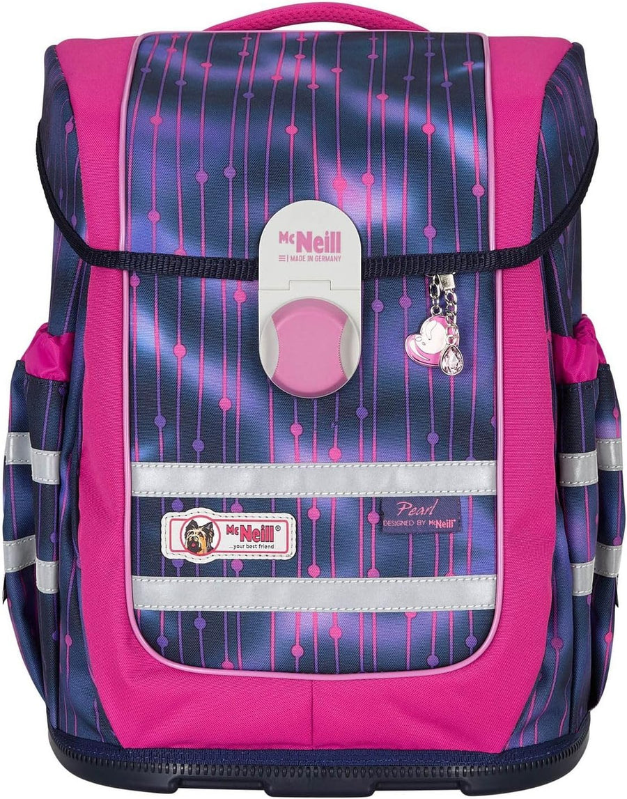 PRODUKTBESCHREIBUNGEN McNeill Schulranzen mit tollem Muster Daten Schulranzen: o Masse: Breite ca. 30 cm, Höhe ca. 40 cm, Tiefe ca. 22 cm o Gewicht: ca. 1540 g o Volumen: ca. 20 l o Farbe: Pearl (Pink / Violett) o 1 Tragegriff gepolstert: ca. 15 cm o 2 Schultergurte ergonomisch geformt, atmungsaktiv, gepolstert, stufenlos verstellbar: ca. 41 cm - 68 cm o 1 Brustgurt, stufenlos verstellbar: ca. 11 cm - 28 cm o 1 Beckenflosse, abnehmbar, gepolstert, stufenlos verstellbar: ca. 35 cm - 68 cm o Material: Polyester o Lieferumfang: McNeill Schulranzen mit Etikett, Stundenplan, Beckenflosse, McTaggie, Anhänger Ausstattung Schulranzen: o Schulranzen wird mit Überschlagklappe und Schnappverschluss geschlossen o Im Hauptfach 1 Einschubfach o Auf der Überschlagklappe 1 Sichtfach für Stundenpläne o Auf der Vorderseite 1 aufgesetztes Einschubfach, in dem sich 2 Einschubfächer und 1 Schlüsselfinder befinden o Auf der rechten und linken Seite 1 elastisches Einschubfach für Trinkflaschen oder Regenschirme o Rückseite ist ergonomisch geformt und gepolstert o Mit Brustgurt an den Schultergurten, Lastenkontrollriemen an den Schultergurten, höhenverstellbarem Tragegurtsystem ausgestattet o Mit verstärktem Boden und Schutzfüsschen ausgestattet o Ist reflektierend o Besitzt flexible Rückenlängenanpassung o Ist gross genug für DIN A4 o Das McNeill Logo ist gut sichtbar eingearbeitet McNeill Ergo Complete Schoolbag - Der Schulranzen, der leuchtet Mit diesem Schulranzen von McNeill ist Ihr Kind für alle Situationen bestens vorbereitet! Im geräumigen Hauptfach bringen Sie alle Hefte und Bücher geordnet unter. Zudem ist noch ausreichend Platz für, Vesperdose und Trinkflasche. Die Rückseite des McNeill Ergo Complete Schoolbag ist gepolstert und