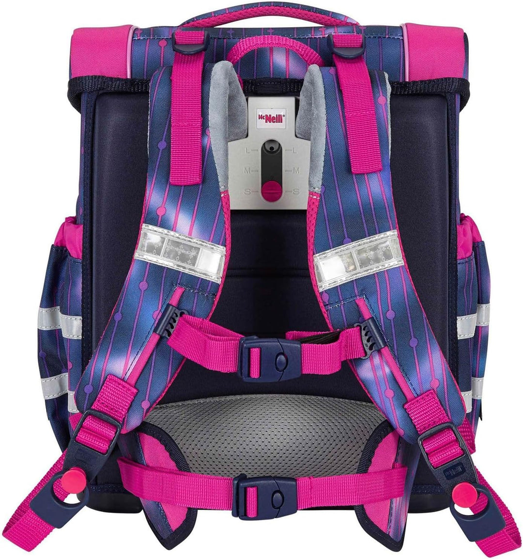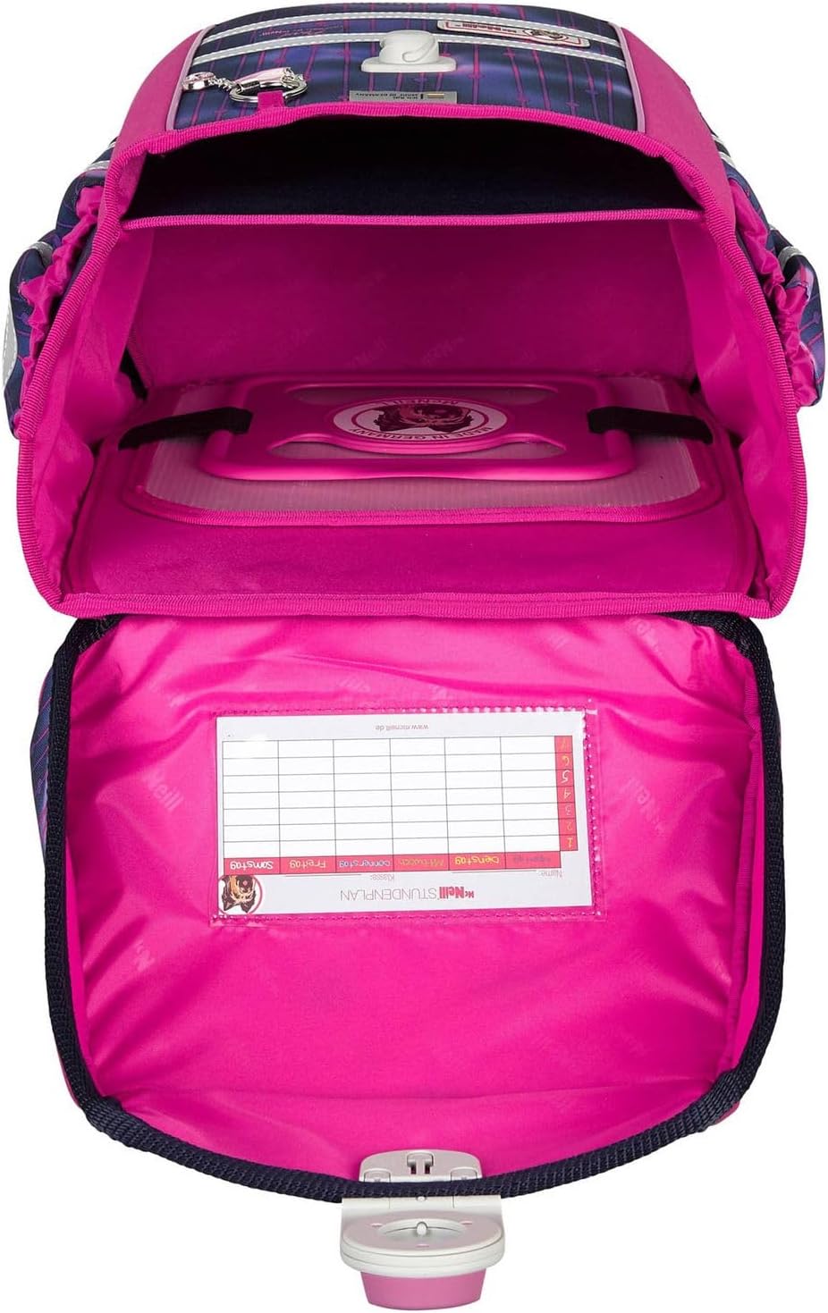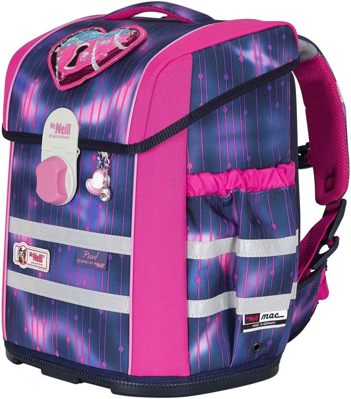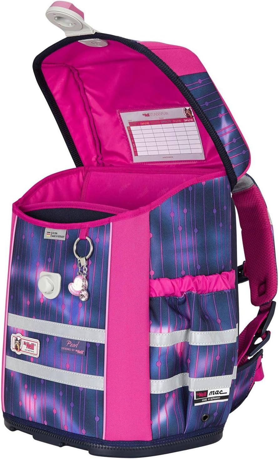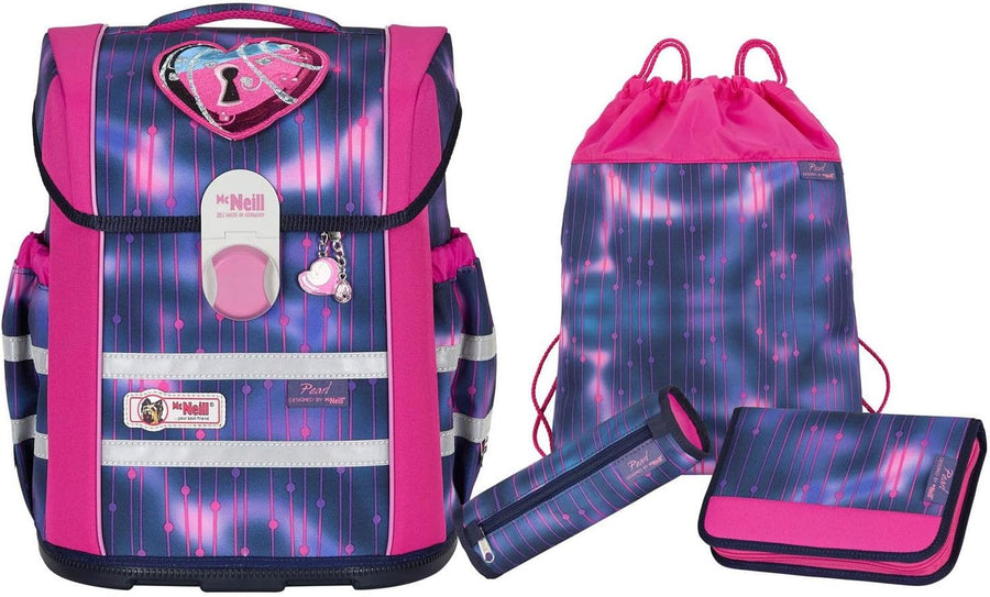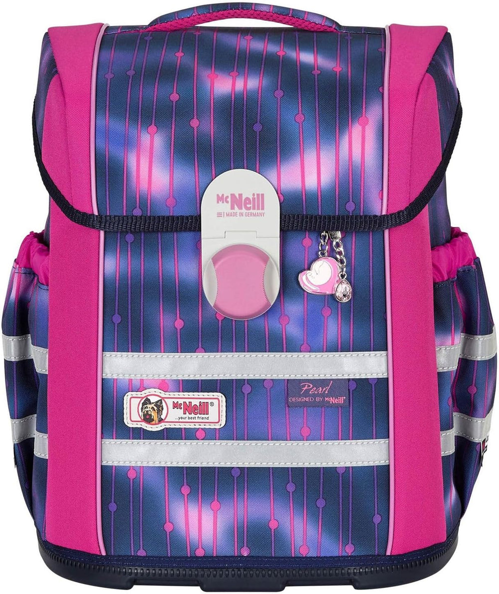 PRODUKTBESCHREIBUNGEN McNeill Schulranzen für Schulkinder Lieferumfang McNeill Set: o Schulranzen mit Etikett, Stundenplan, Beckenflosse, Brustgurt, Anhänger o Federmäppchen mit Etikett und Stundenplan, Stifte, Lineal, Radiergummi, Spitzer, Geodreieck o Schlampermäppchen mit Etikett o Sportbeutel mit Etikett Daten Schulranzen: o Masse: Breite ca. 28 cm, Höhe ca. 38 cm, Tiefe ca. 20 cm o Gewicht: ca. 1388 g o Volumen: ca. 18 l o Farbe: Pearl (Violett / Pink) o 1 Tragegriff gepolstert: ca. 15 cm o 2 Schultergurte stufenlos verstellbar, atmungsaktiv, gepolstert: ca. 38 cm - 64 cm o 1 Brustgurt abnehmbar, stufenlos verstellbar: ca. 11 cm - 28 cm o 1 Beckenflosse stufenlos verstellbar, abnehmbar, gepolstert: ca. 35 cm - 68 cm o Material: Polyester o Lieferumfang: McNeill Schulranzen mit Etikett, Stundenplan, Beckenflosse, Brustgurt, Anhänger, McTaggie, Trennwand Ausstattung Schulranzen: o Schulranzen wird mit Überschlagklappe und Schnappverschluss geschlossen o Im Hauptfach 1 Fach mit Gummizug und 1 Sichtfach für Stundenpläne o Auf der Vorderseite 1 Einschubfach o Auf der rechten und linken Seite 1 elastisches Einschubfach für Trinkflaschen oder Regenschirme o Rückseite ist ergonomisch geformt und gepolstert o Mit Brustgurt an den Schultergurten und Lastenkontrollriemen an den Schultergurten ausgestattet o Mit verstärktem Boden und Schutzfüsschen ausgestattet o Ist reflektierend o Besitzt flexible Rückenlängenanpassung o Ist gross genug für DIN A4 o Ist standfest o Das McNeill Logo ist gut sichtbar eingearbeitet Daten Federmäppchen: o Masse geschlossen: Breite ca. 20 cm, Höhe ca. 13 cm, Tiefe ca. 4 cm o Masse halb offen: Breite ca. 28 cm, Höhe ca. 20 cm, Tiefe ca. 2 c