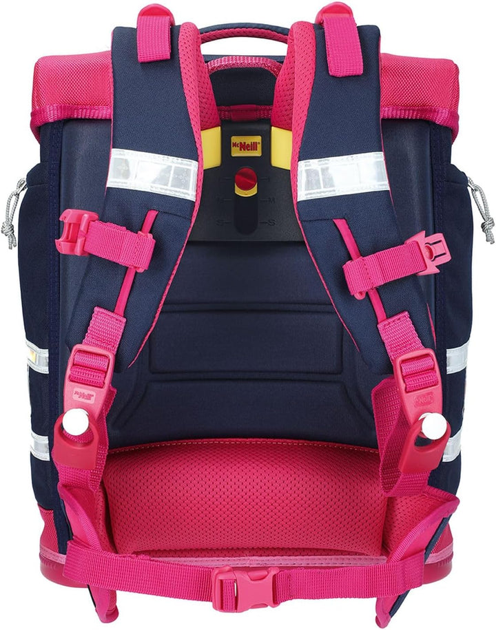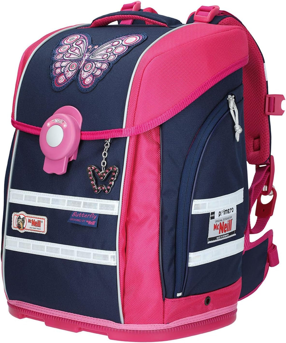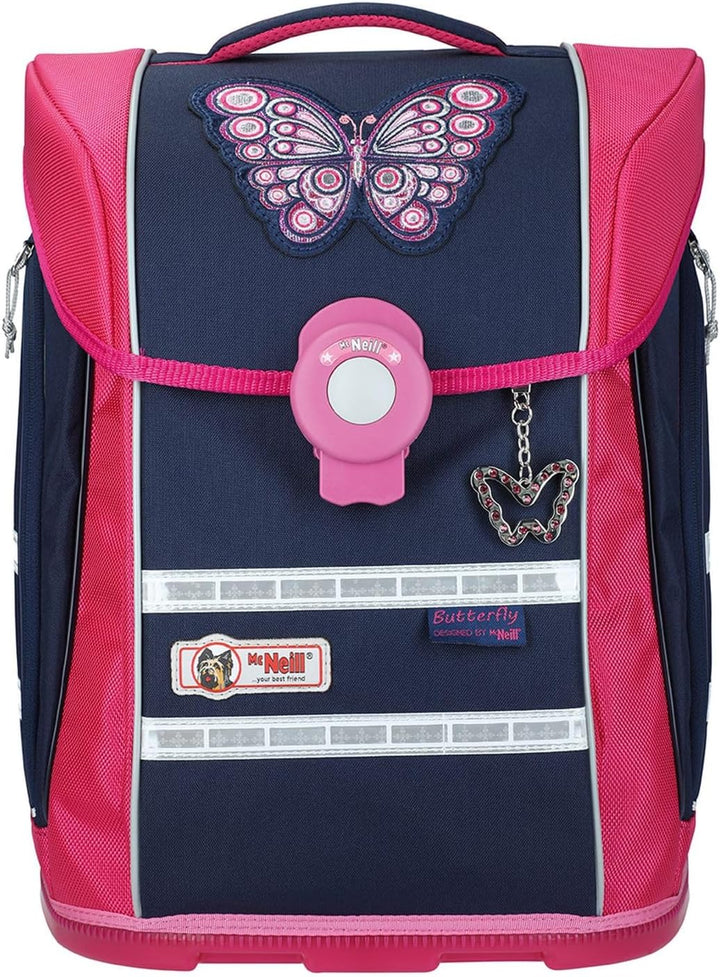 PRODUKTBESCHREIBUNGEN McNeill Schulranzen in tollen Designs Daten Schulranzen: o Masse: Breite ca. 29 cm, Höhe ca. 36 cm, Tiefe ca. 18 cm o Gewicht: ca. 1272 g o Volumen: ca. 20 l o Farbe: Butterfly (blau / pink) o 1 Tragegriff gepolstert: ca. 15 cm o 2 Schultergurte stufenlos verstellbar, atmungsaktiv, gepolstert: ca. 38 cm - 64 cm o 1 Brustgurt abnehmbar, stufenlos verstellbar: ca. 11 cm - 28 cm o 1 Beckenflosse stufenlos verstellbar, abnehmbar, gepolstert: ca. 35 cm - 68 cm o Material: Polyester o Lieferumfang: McNeill Schulranzen mit Etikett, Stundenplan, Beckenflosse, Brustgurt, Anhänger Ausstattung Schulranzen: o Schulranzen wird mit Überschlagklappe und Schnappverschluss geschlossen o Im Hauptfach 2 Einschubfächer und 1 Schlüsselfinder o Auf der Überschlagklappe 1 Sichtfach für Stundenpläne o Auf der Vorderseite 1 aufgesetztes Einschubfach, in dem sich 2 Einschubfächer befinden o Auf der rechten und linken Seite 1 Zipperfach für Trinkflaschen oder Regenschirme o Rückseite ist ergonomisch geformt und gepolstert o Mit Brustgurt an den Schultergurten, Lastenkontrollriemen an den Schultergurten, höhenverstellbarem Tragegurtsystem ausgestattet o Mit verstärktem Boden und Schutzfüsschen ausgestattet o Ist reflektierend o Besitzt flexible Rückenlängenanpassung o Ist gross genug für DIN A4 o Das McNeill Logo ist gut sichtbar eingearbeitet McNeill Ergo Primero Schoolbag - Der super coole Schulranzen Dank diesem Schulranzen von McNeill hat Ihr Kind alles was es für einen perfekten Schultag benötigt dabei. Im geräumigen Hauptfach bringen Sie alle Hefte und Bücher geordnet unter. Zudem ist noch ausreichend Platz für Mäppchen, Vesperdose und Trinkflasche. Glücklich startet Ihr Kind mit dem McNeill Ergo Primero Schoolba