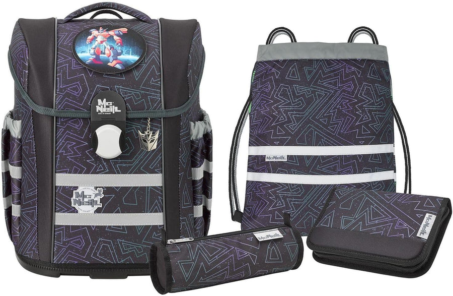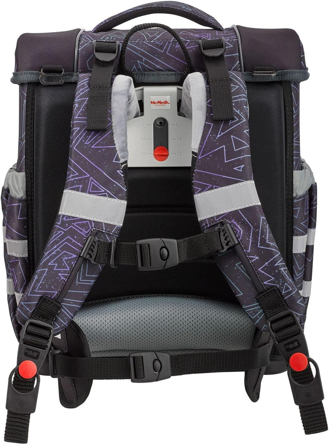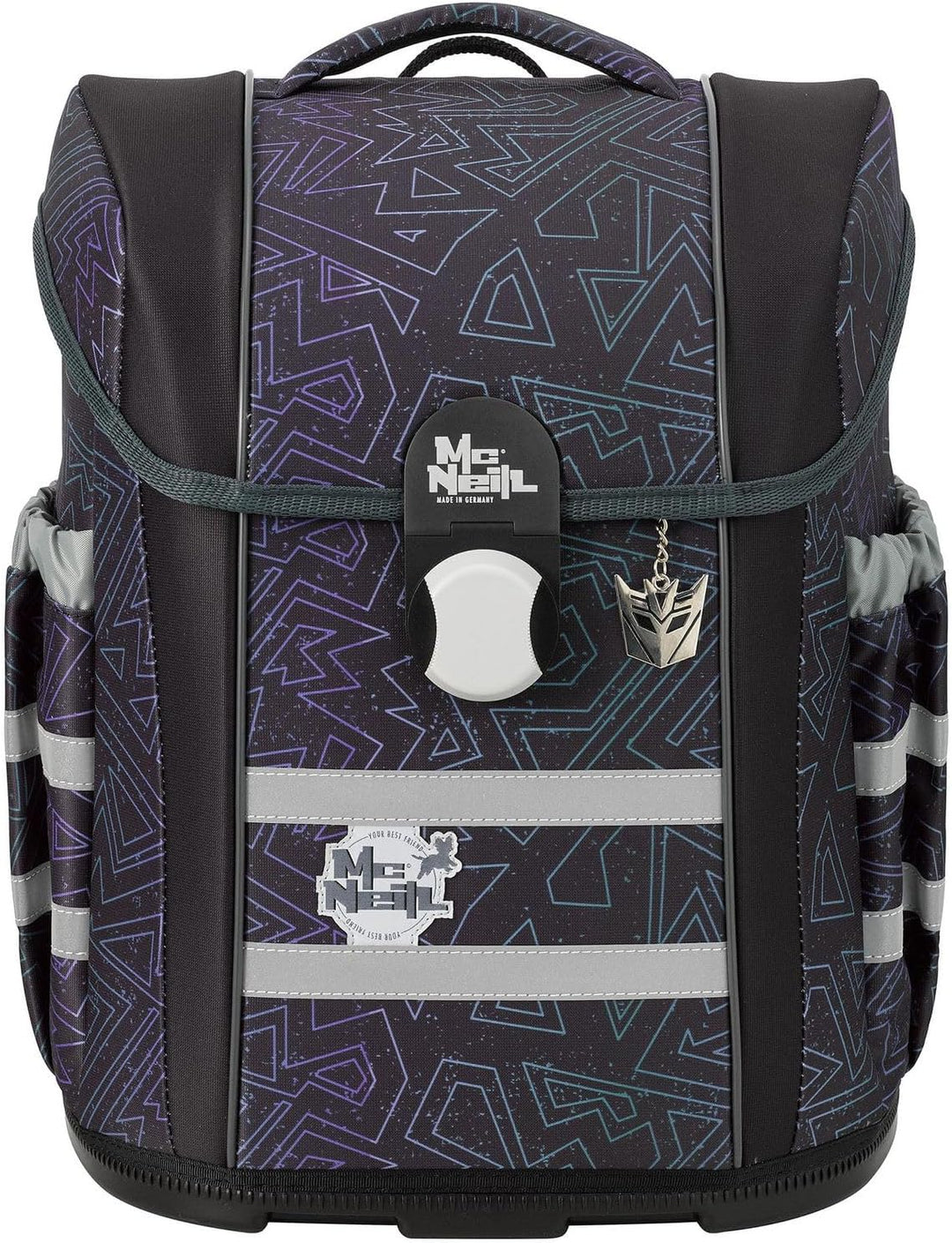PRODUKTBESCHREIBUNGEN McNeill Schulranzen in einmaligem Muster Lieferumfang McNeill Set: o Schulranzen mit Etikett, Stundenplan, Beckenflosse, McTaggie o Schlüsselanhänger (Schlüsselanhänger) mit Etikett und Schlüsselring o Schlampermäppchen (Schlamperetui) mit Etikett o Federmäppchen (Federmäppchen) mit Etikett und Stundenplan, Geodreieck, Lineal, Radiergummi, Spitzer, Buntstift, Bleistift o Sportbeutel (Sportbeutel) mit Etikett Daten Schulranzen: o Masse: Breite ca. 30 cm, Höhe ca. 36 cm, Tiefe ca. 20 cm o Gewicht: ca. 1430 g o Volumen: ca. 18 l o Farbe: Tron (schwarz / blaugrau / blau) o Auf der Oberseite 1 Tragegriff gepolstert: ca. 15 cm o Auf der Rückseite 1 Tragegriff verstärkt: ca. 15 cm o 2 Schultergurte ergonomisch geformt, atmungsaktiv, gepolstert, stufenlos verstellbar: ca. 35 cm - 70 cm o 1 Brustgurt stufenlos verstellbar: ca. 15 cm - 35 cm o 1 Beckenflosse, abnehmbar, gepolstert: ca. 55 cm o 1 Hüftgurt stufenlos verstellbar: ca. 20 cm - 50 cm o Material: Polyester o Lieferumfang: McNeill Schulranzen mit Etikett, 1 x Stundenplan, 1 x Beckenflosse, 1 x McTaggie, 1 x Trennwand Ausstattung Schulranzen: o Schulranzen wird mit Überschlagklappe und Magnetverschluss geschlossen o Im Hauptfach 1 Einschubfach, 1 herausnehmbare Trennwand und 1 elastische Trennwand o Auf der Oberseite 1 Magnetbefestigung für McTaggie o Auf der Innenseite des Deckels 1 Sichtfach für Stundenpläne o Auf der Vorderseite 2 Befestigungsschlaufen für Anhänger o Auf der rechten und linken Seite 1 elastisches Einschubfach für Trinkflaschen oder Regenschirme und 1 Auslauföse o Auf der Rückseite 2 Haken für Sportbeutel o Rückseite ist ergonomisch geformt und gepolstert o Mit höhenverstellbarem Brustgurt, Lastenkontroll