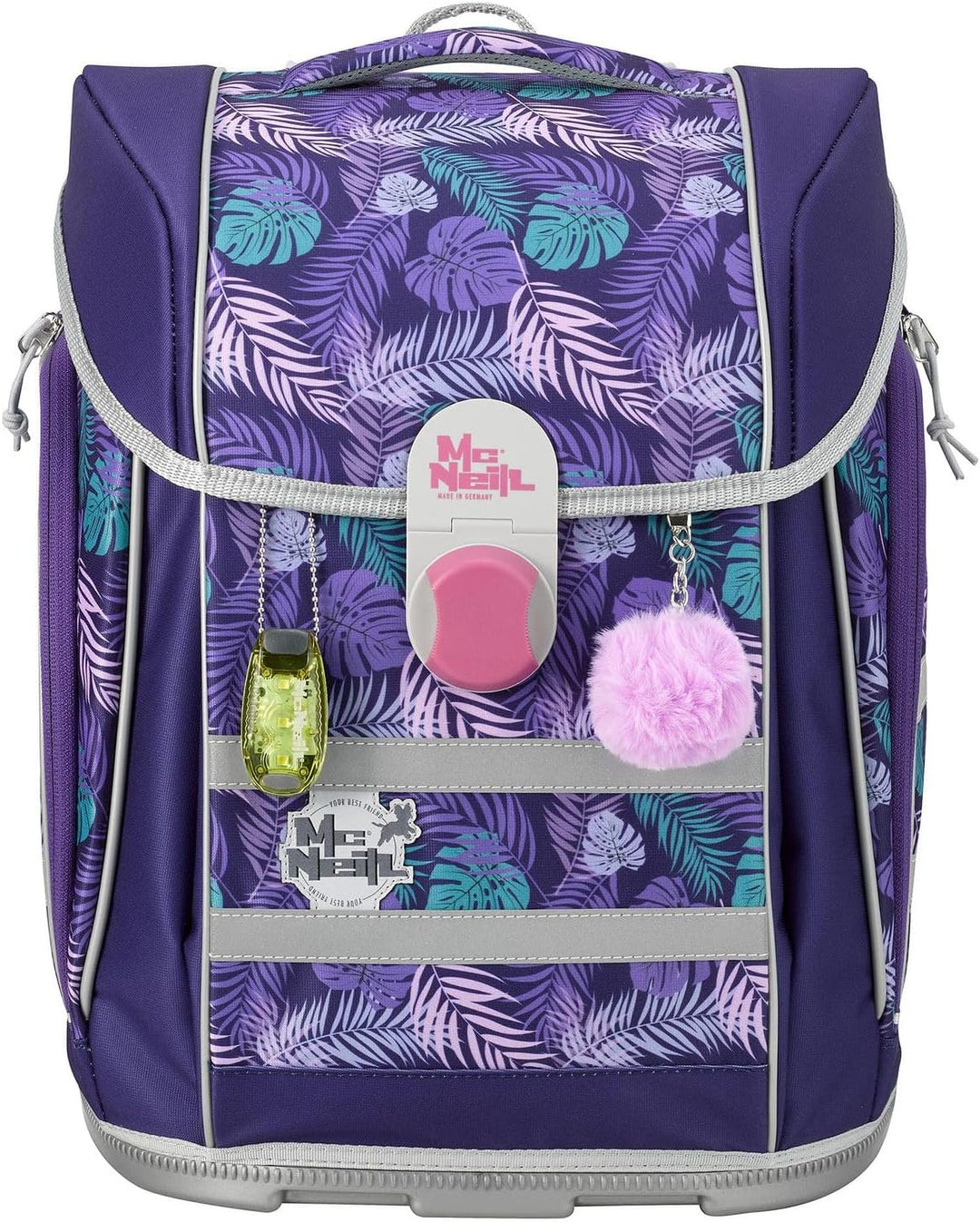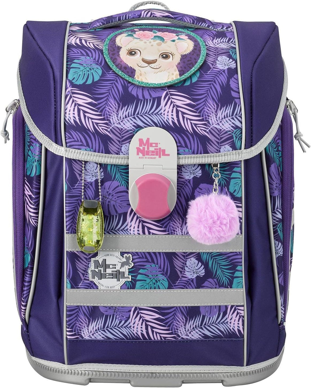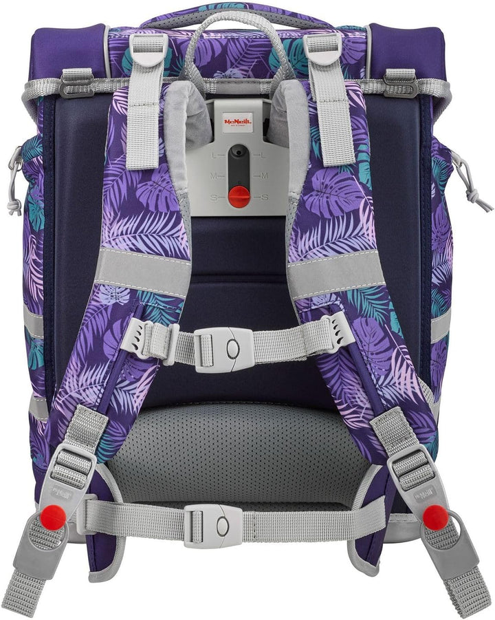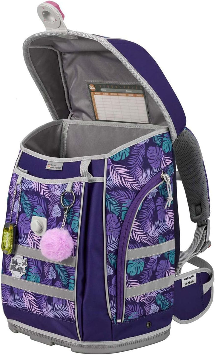 PRODUKTBESCHREIBUNGEN McNeill Schulranzen schenkt jedem Kind ein Lächeln ins Gesicht Lieferumfang McNeill Set: o Schulranzen mit Etikett, Stundenplan, Beckenflosse, McTaggie o Schlüsselanhänger mit Etikett und Schlüsselring o Federmäppchen mit Etikett und Stundenplan, Geodreieck, Lineal, Radiergummi, Spitzer, Buntstift, Bleistift o Schlampermäppchen mit Etikett o Sportbeutel mit Etikett Daten Schulranzen: o Masse: Breite ca. 28 cm, Höhe ca. 36 cm, Tiefe ca. 20 cm o Gewicht: ca. 1000 g o Volumen: ca. 20 l o Farbe: Dschungel (violett / flieder / türkis) o Auf der Oberseite 1 Tragegriff gepolstert: ca. 13 cm o 2 Schultergurte ergonomisch geformt, atmungsaktiv, gepolstert, stufenlos verstellbar: ca. 35 cm - 65 cm o 1 Brustgurt stufenlos verstellbar: ca. 10 cm - 30 cm o 1 Beckenflosse stufenlos verstellbar, abnehmbar, gepolstert: ca. 35 cm - 70 cm o 1 Tragegriff: ca. 11 cm o Material: Polyester o Lieferumfang: McNeill Schulranzen mit Etikett, 1 x McTaggie, 1 x Stundenplan, 1 x Beckenflosse, 1 x LED Licht, 1 x Kette Ausstattung Schulranzen: o Schulranzen wird mit Überschlagklappe und Schnappverschluss geschlossen o Im Hauptfach 2 Einschubfächer o Auf der Überschlagklappe 1 Sichtfach für Stundenpläne o Auf der rechten und linken Seite 1 aufgesetztes Zipperfach o Auf der Vorderseite 1 aufgesetztes Einschubfach, in dem sich 1 Schlüsselfinder und 2 Einschubfächer befindet o Rückseite ist ergonomisch geformt und gepolstert o Mit höhenverstellbarem Brustgurt, Lastenkontrollriemen an den Schultergurten, höhenverstellbarem Tragegurtsystem ausgestattet o Mit verstärktem Boden und fester Bodenplatte ausgestattet o Ist reflektierend o Besitzt flexible Rückenlängenanpassung o Ist gross genug für DIN A4