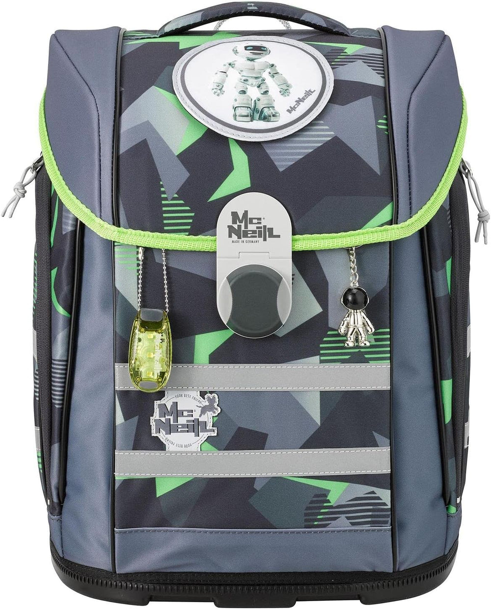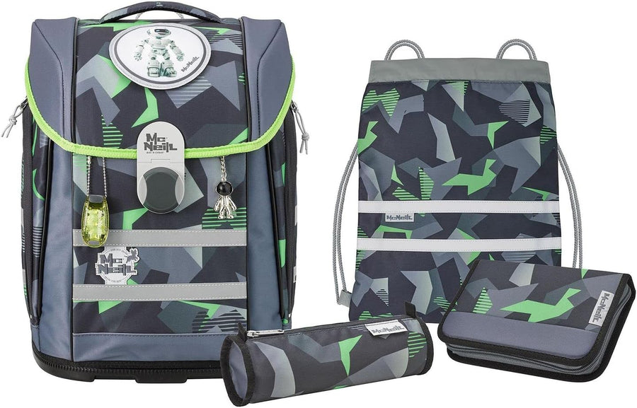 PRODUKTBESCHREIBUNGEN McNeill Schulranzen schenkt jedem Kind ein Lächeln ins Gesicht Lieferumfang McNeill Set: o Schulranzen mit Etikett, Stundenplan, Beckenflosse, McTaggie o Schlüsselanhänger mit Etikett und Schlüsselring o Federmäppchen mit Etikett und Stundenplan, Geodreieck, Lineal, Radiergummi, Spitzer, Buntstift, Bleistift o Schlampermäppchen mit Etikett o Sportbeutel mit Etikett Daten Schulranzen: o Masse: Breite ca. 28 cm, Höhe ca. 36 cm, Tiefe ca. 20 cm o Gewicht: ca. 1000 g o Volumen: ca. 20 l o Farbe: Techno (grau / dunkelgrau / hellgrün) o Auf der Oberseite 1 Tragegriff gepolstert: ca. 13 cm o 2 Schultergurte ergonomisch geformt, atmungsaktiv, gepolstert, stufenlos verstellbar: ca. 35 cm - 65 cm o 1 Brustgurt stufenlos verstellbar: ca. 10 cm - 30 cm o 1 Beckenflosse stufenlos verstellbar, abnehmbar, gepolstert: ca. 35 cm - 70 cm o 1 Tragegriff: ca. 11 cm o Material: Polyester o Lieferumfang: McNeill Schulranzen mit Etikett, 1 x McTaggie, 1 x Stundenplan, 1 x Beckenflosse, 1 x LED Licht, 1 x Kette Ausstattung Schulranzen: o Schulranzen wird mit Überschlagklappe und Schnappverschluss geschlossen o Im Hauptfach 2 Einschubfächer o Auf der Überschlagklappe 1 Sichtfach für Stundenpläne o Auf der rechten und linken Seite 1 aufgesetztes Zipperfach o Auf der Vorderseite 1 aufgesetztes Einschubfach, in dem sich 1 Schlüsselfinder und 2 Einschubfächer befindet o Rückseite ist ergonomisch geformt und gepolstert o Mit höhenverstellbarem Brustgurt, Lastenkontrollriemen an den Schultergurten, höhenverstellbarem Tragegurtsystem ausgestattet o Mit verstärktem Boden und fester Bodenplatte ausgestattet o Ist reflektierend o Besitzt flexible Rückenlängenanpassung o Ist gross genug für DIN A4