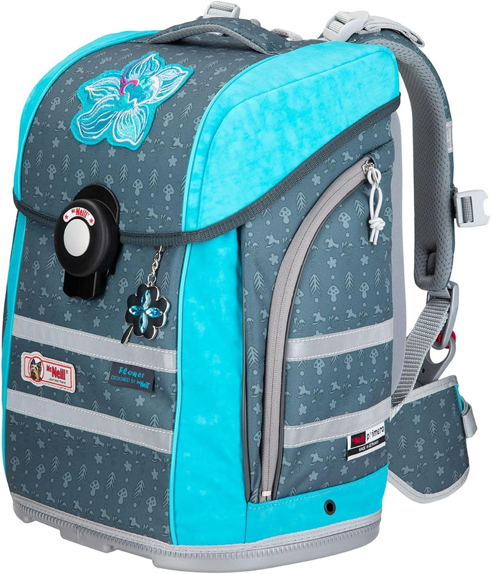 PRODUKTBESCHREIBUNGEN McNeill Schulranzen in tollen Designs Daten Schulranzen: o Masse: Breite ca. 29 cm, Höhe ca. 36 cm, Tiefe ca. 18 cm o Gewicht: ca. 1272 g o Volumen: ca. 20 l o Farbe: Flower (grau / blau) o 1 Tragegriff gepolstert: ca. 15 cm o 2 Schultergurte stufenlos verstellbar, atmungsaktiv, gepolstert: ca. 38 cm - 64 cm o 1 Brustgurt abnehmbar, stufenlos verstellbar: ca. 11 cm - 28 cm o 1 Beckenflosse stufenlos verstellbar, abnehmbar, gepolstert: ca. 35 cm - 68 cm o Material: Polyester o Lieferumfang: McNeill Schulranzen mit Etikett, Stundenplan, Beckenflosse, Brustgurt, Anhänger Ausstattung Schulranzen: o Schulranzen wird mit Überschlagklappe und Schnappverschluss geschlossen o Im Hauptfach 2 Einschubfächer und 1 Schlüsselfinder o Auf der Überschlagklappe 1 Sichtfach für Stundenpläne o Auf der Vorderseite 1 aufgesetztes Einschubfach, in dem sich 2 Einschubfächer befinden o Auf der rechten und linken Seite 1 Zipperfach für Trinkflaschen oder Regenschirme o Rückseite ist ergonomisch geformt und gepolstert o Mit Brustgurt an den Schultergurten, Lastenkontrollriemen an den Schultergurten, höhenverstellbarem Tragegurtsystem ausgestattet o Mit verstärktem Boden und Schutzfüsschen ausgestattet o Ist reflektierend o Besitzt flexible Rückenlängenanpassung o Ist gross genug für DIN A4 o Das McNeill Logo ist gut sichtbar eingearbeitet McNeill Ergo Primero Schoolbag - Der super coole Schulranzen Dank diesem Schulranzen von McNeill hat Ihr Kind alles was es für einen perfekten Schultag benötigt dabei. Im geräumigen Hauptfach bringen Sie alle Hefte und Bücher geordnet unter. Zudem ist noch ausreichend Platz für Mäppchen, Vesperdose und Trinkflasche. Glücklich startet Ihr Kind mit dem McNeill Ergo Primero Schoolbag i