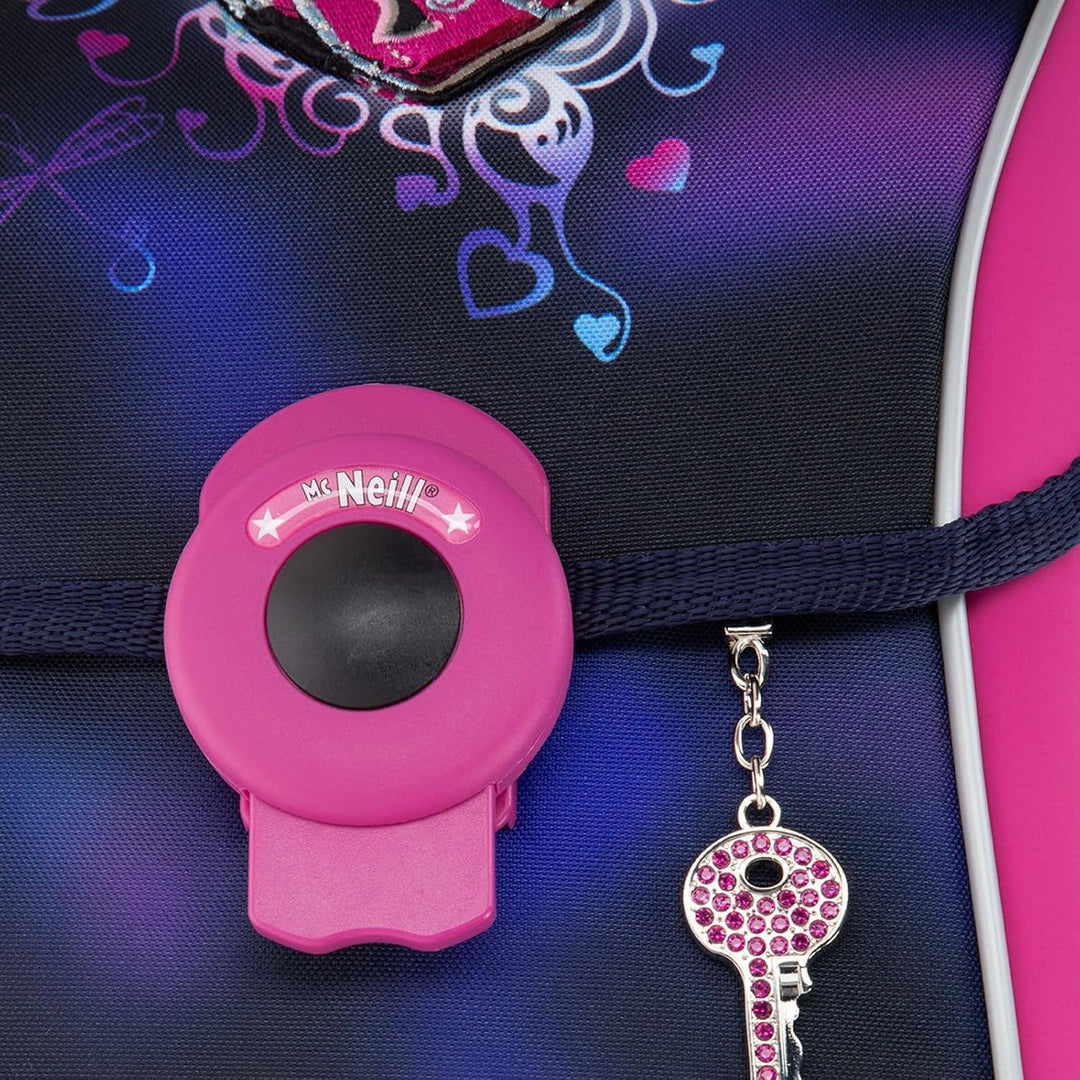 PRODUKTBESCHREIBUNGEN McNeill Schulranzen in tollem Design Daten Schulranzen: o Masse: Breite ca. 30 cm, Höhe ca. 38 cm, Tiefe ca. 20 cm o Gewicht: ca. 1388 g o Volumen: ca. 20 l o Farbe: Lovely (Violett / Rosa / Pink) o 1 Tragegriff gepolstert: ca. 15 cm o 2 Schultergurte stufenlos verstellbar, atmungsaktiv, gepolstert: ca. 38 cm - 64 cm o 1 Brustgurt abnehmbar, stufenlos verstellbar: ca. 11 cm - 28 cm o 1 Beckenflosse stufenlos verstellbar, abnehmbar, gepolstert: ca. 35 cm - 68 cm o Material: Polyester o Lieferumfang: McNeill Schulranzen mit Etikett, Stundenplan, Beckenflosse, Brustgurt, Anhänger Ausstattung Schulranzen: o Schulranzen wird mit Überschlagklappe und Schnappverschluss geschlossen o Im Hauptfach 1 Einschubfach o Auf der Überschlagklappe 1 Sichtfach für Stundenpläne o Auf der Vorderseite 1 aufgesetztes Einschubfach mit Klettverschluss, in dem sich 2 Einschubfächer und 1 Schlüsselfinder befinden o Auf der rechten und linken Seite 1 Einschubfach mit Zugband für Trinkflaschen oder Regenschirme o Ausserdem auf der Vorderseite 1 Einschubfach mit Klettverschluss o Rückseite ist ergonomisch geformt und gepolstert o Mit Brustgurt an den Schultergurten, Lastenkontrollriemen an den Schultergurten, höhenverstellbarem Tragegurtsystem ausgestattet o Mit verstärktem Boden und Schutzfüsschen ausgestattet o Ist reflektierend o Besitzt flexible Rückenlängenanpassung o Ist gross genug für DIN A4 o Das McNeill Logo ist gut sichtbar eingearbeitet McNeill Ergo Pure Flex Schoolbag - Der Schulranzen mit viel Stauraum Dank diesem Schulranzen von McNeill hat Ihr Kind alles was es für einen perfekten Schultag benötigt dabei. Im geräumigen Hauptfach bringen Sie alle Hefte und Bücher geordnet unter. Zudem ist noch ausreich