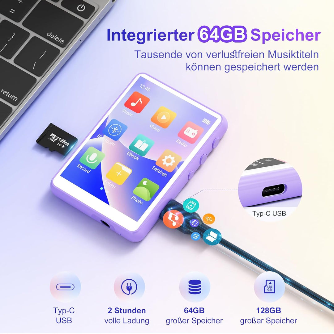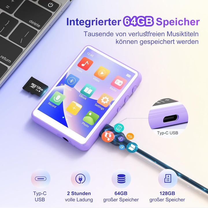 • ➽ 【Schnellere Datenübertragung】Mit dem USB-C-Anschluss können Sie Ihren musik player problemlos an verschiedene Geräte wie Laptops, Smartphones und Tablets anschliessen, ohne dass es zu Kompatibilitätsproblemen kommt. Diese Funktion ermöglicht