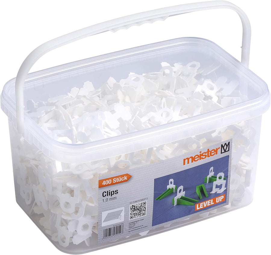 - PRAKTISCHES SET: 400 Clips zur Ergänzung bestehender Nivelliersysteme | Übersichtliche Aufbewahrung im robusten Kunststoffeimer | Passend für weiteres Zubehör vom Nivelliersystem "Level Up"
