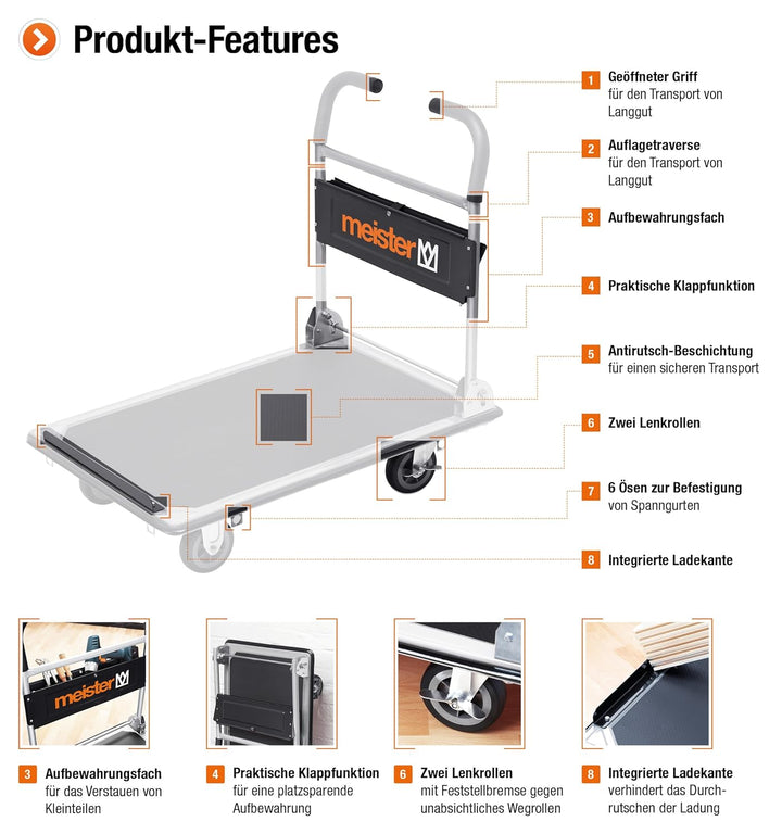 - SICHERER TRANSPORT: Ladefläche mit Antirutsch-Beschichtung | 6 Ösen zur Befestigung von Spanngurten zur Sicherung der Ladung | 2 Rollen mit Feststellbremse gegen unabsichtliches Wegrollen