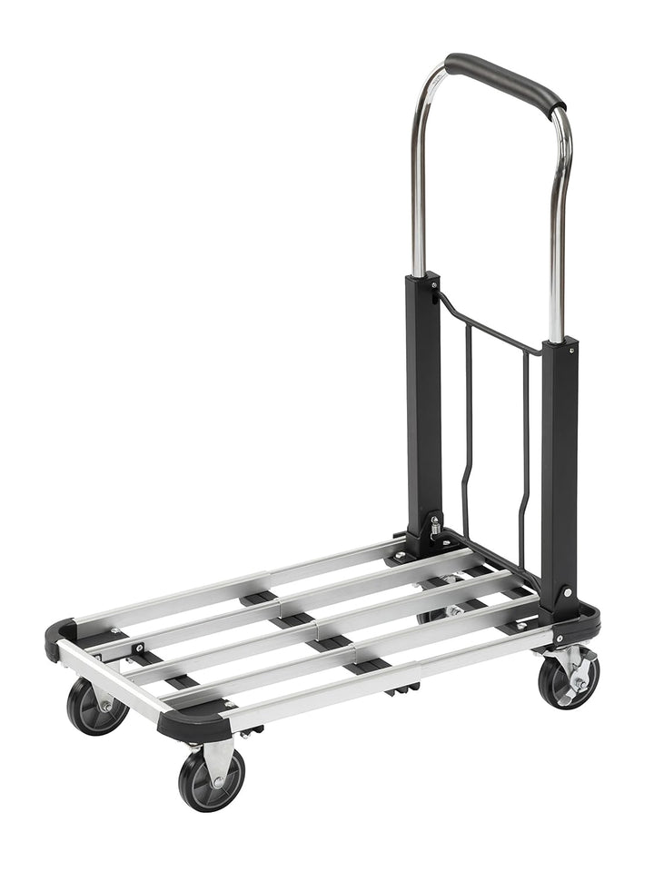 - PRODUKT-DETAILS: Tragfähigkeit (max.): 150 kg | Abmessung Ladefläche: 420 - 630 x 410 mm | Ladehöhe: 160 mm | Griffhöhe: 695 - 950 mm | Rad-Ø: 100 mm (4 Zoll) | Material Räder: Gummi | Material Gestell: Aluminium | Gewicht: 8,5 kg
