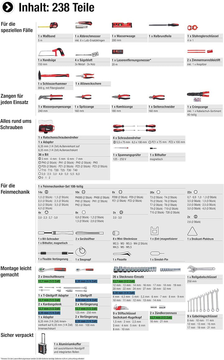 - UMFANGREICHES SET: Praktische Hilfsmittel wie Laserentfernungsmesser, Hammer & Säge | Zangen für jeden Einsatz | Alles rund ums Schrauben von Bits, Schraubendrehern & Stiftschlüsseln, bis hin zu Stecknüssen | Umfangreiches Feinmechaniker-Set für