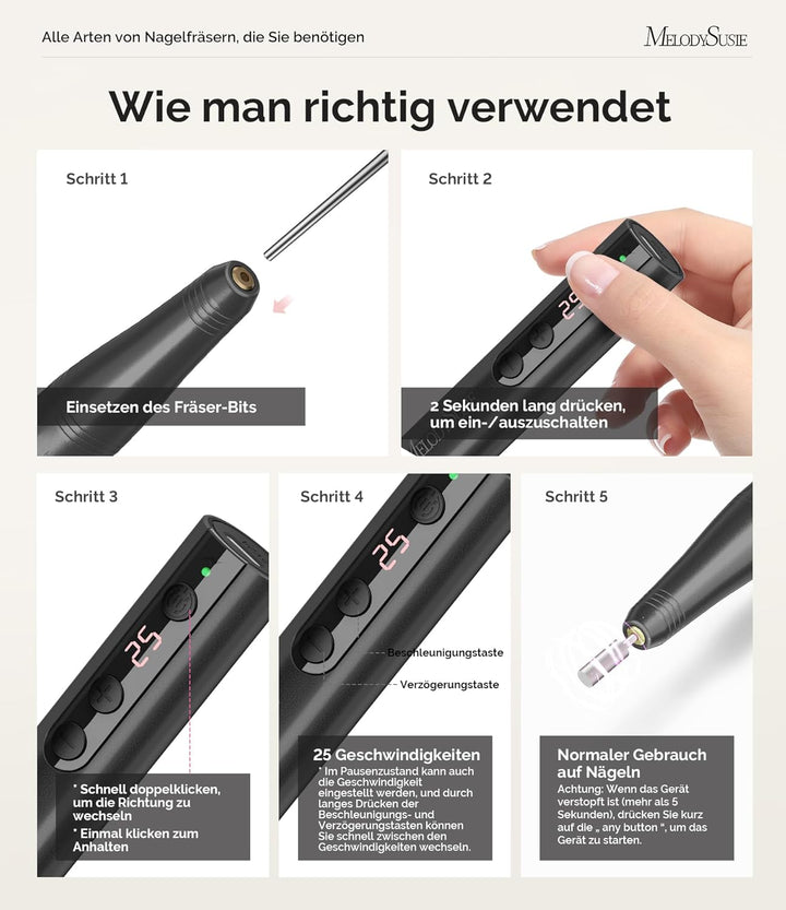 - 25 einstellbare Geschwindigkeiten, umkehrbare Drehrichtung: Mit 25 einstellbaren Geschwindigkeiten von 6000-25.000 U/min, Pausenfunktion und F/R-Richtungsfunktion für Rechts- und Linkshänder. Geeignet für Profis und Anfänger, schneiden Sie Ihre Zeit