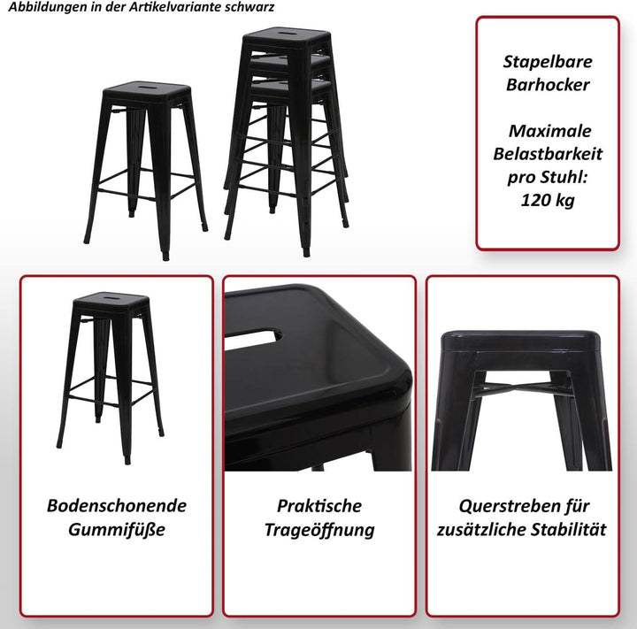 - Lieferumfang: 1x Barhocker | Material: Pulverbeschichtetes Metall | Stapelbar | Praktische Trageöffnung | Bodenschonende Gummifüsse | Querstreben für zusätzliche Stabilität | Fussstütze für bequemeres Sitzen | Maximale Belastbarkeit: 120 kg