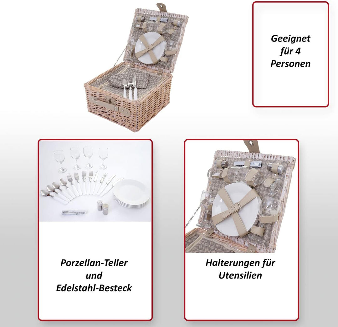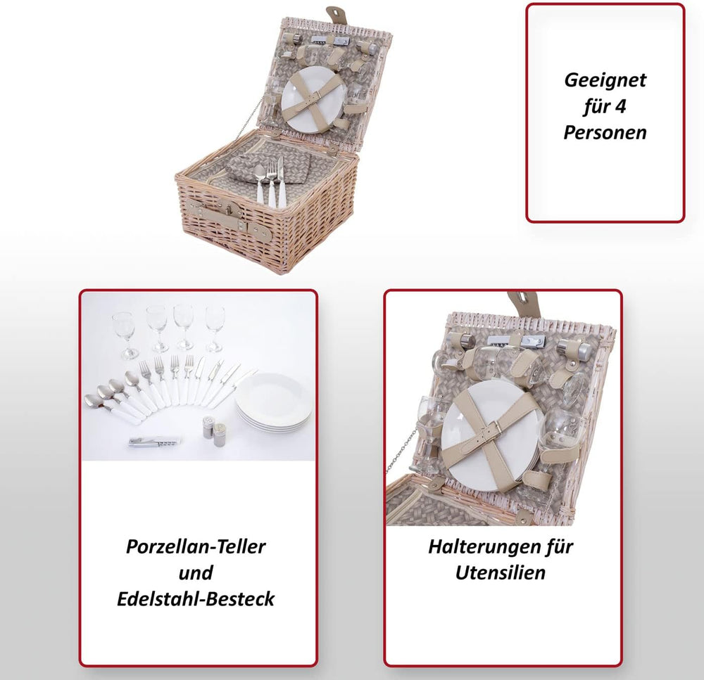 - Für 4 Personen | Mit Kühlfach | Porzellan-Teller | Edelstahl-Besteck | Echtglas | Halterungen für Utensilien | Mit Drehverschluss | Seitlicher Tragegriff