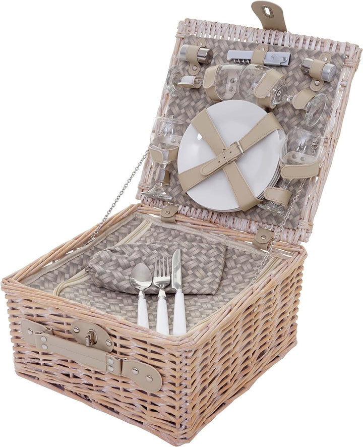 - Dimensionen (HxLxB): 20x30x30cm | Material: Korb: Weidenholz - Innenfutter: 70% Baumwolle 30% Polyester - Besteck: Edelstahl mit Kunststoffgriff - Streuer: Edelstahl mit Kunststoffkappe - Teller: Porzellan - Weingläser: Glas - | Farbe: Korb: braun
