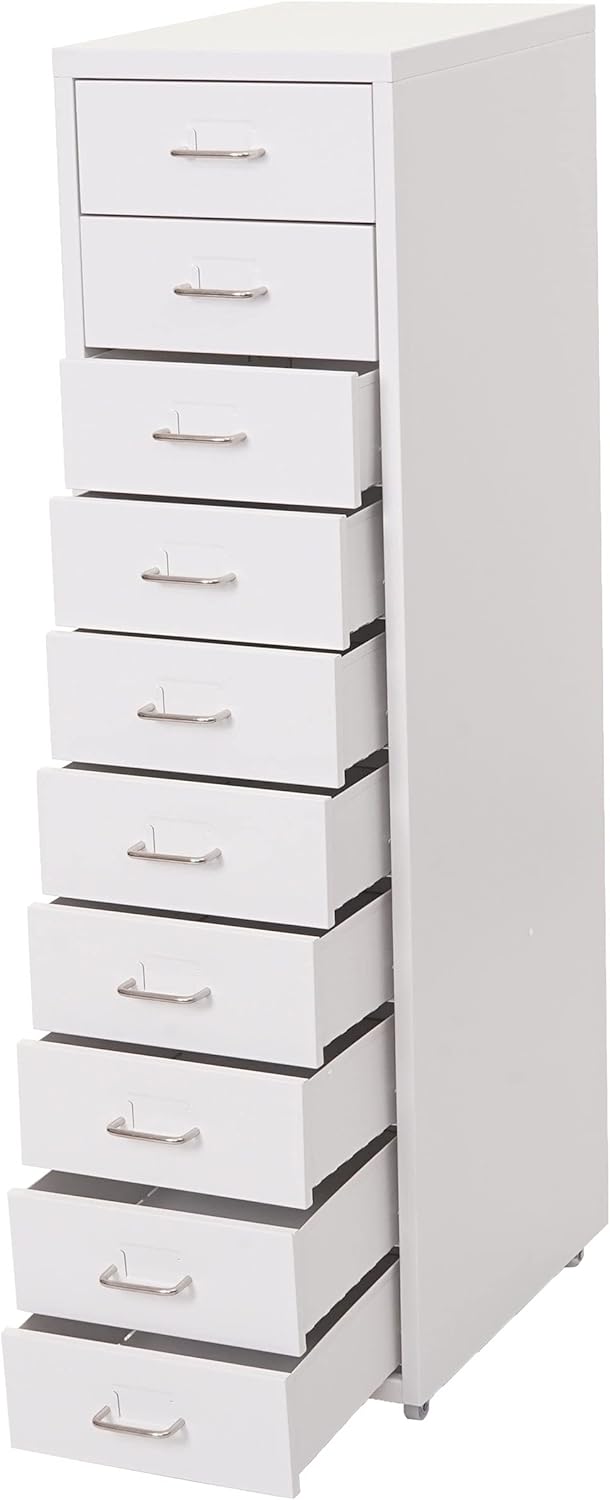 - Dieser schlichte Bürocontainer darf in Ihrem Arbeitszimmer nicht fehlen. Die zehn Schubladen aus Stahl bieten ausreichend Platz für beispielsweise Büroutensilien, Computerzubehör und Dokumente, die nichts auf Ihrem Schreibtisch zu suchen haben.