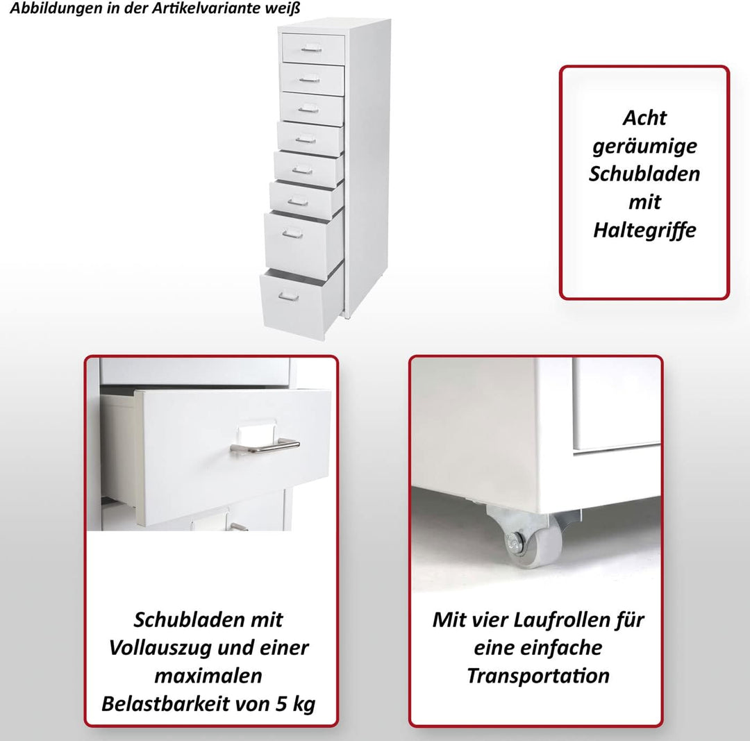 - In unterschiedlichen Ausführungen erhältlich | Acht geräumige Schubladen mit Haltegriffe | BSCI-Sozialstandards geprüft | Schubladen mit Vollauszug | Mit Etikettenhalter inkl. Etiketten | Vier Laufrollen | Maximale Belastbarkeit je Schublade: 5 kg