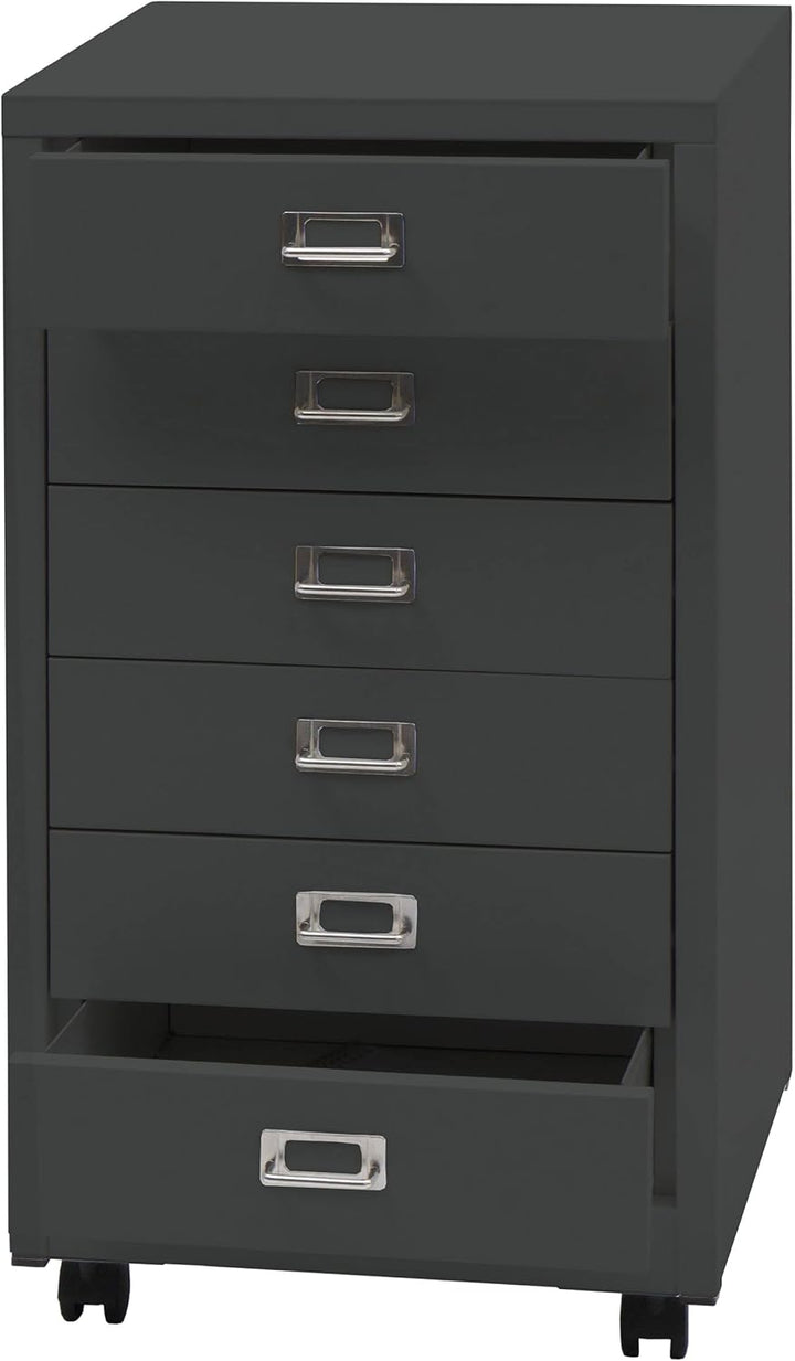 - Dieser schlichte Bürocontainer darf in Ihrem Arbeitszimmer nicht fehlen. Die sechs Schubladen aus Stahl bieten ausreichend Platz für beispielsweise Büroutensilien, Computerzubehör und Dokumente, die nichts auf Ihrem Schreibtisch zu suchen haben.