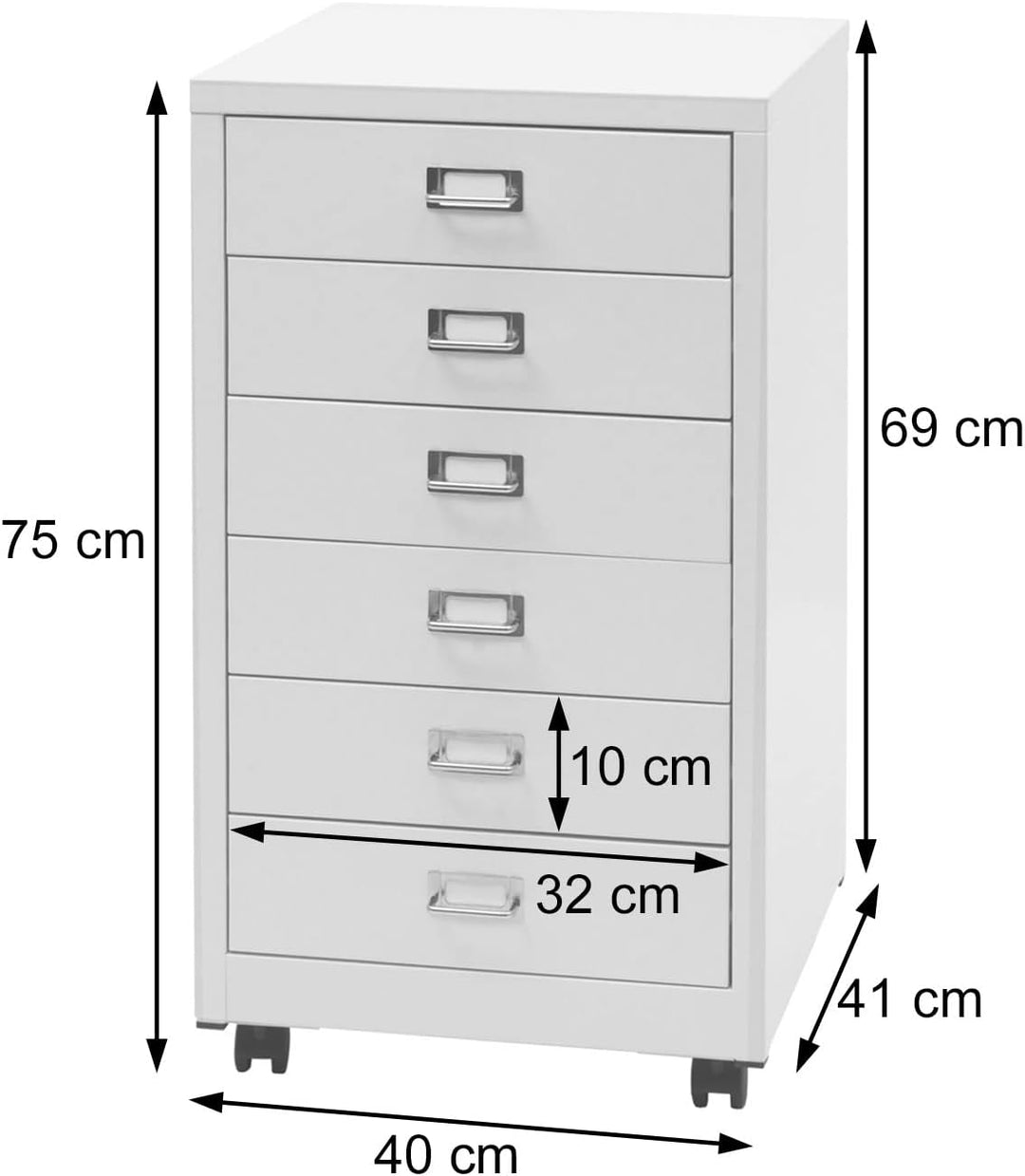 • 6 geräumige Schubladen mit Haltegriffen | Schubladen mit Vollauszug | Mit Etikettenhalter | Vier Laufrollen (zwei feststellbar) | Metallstärke: 0,6 mm
