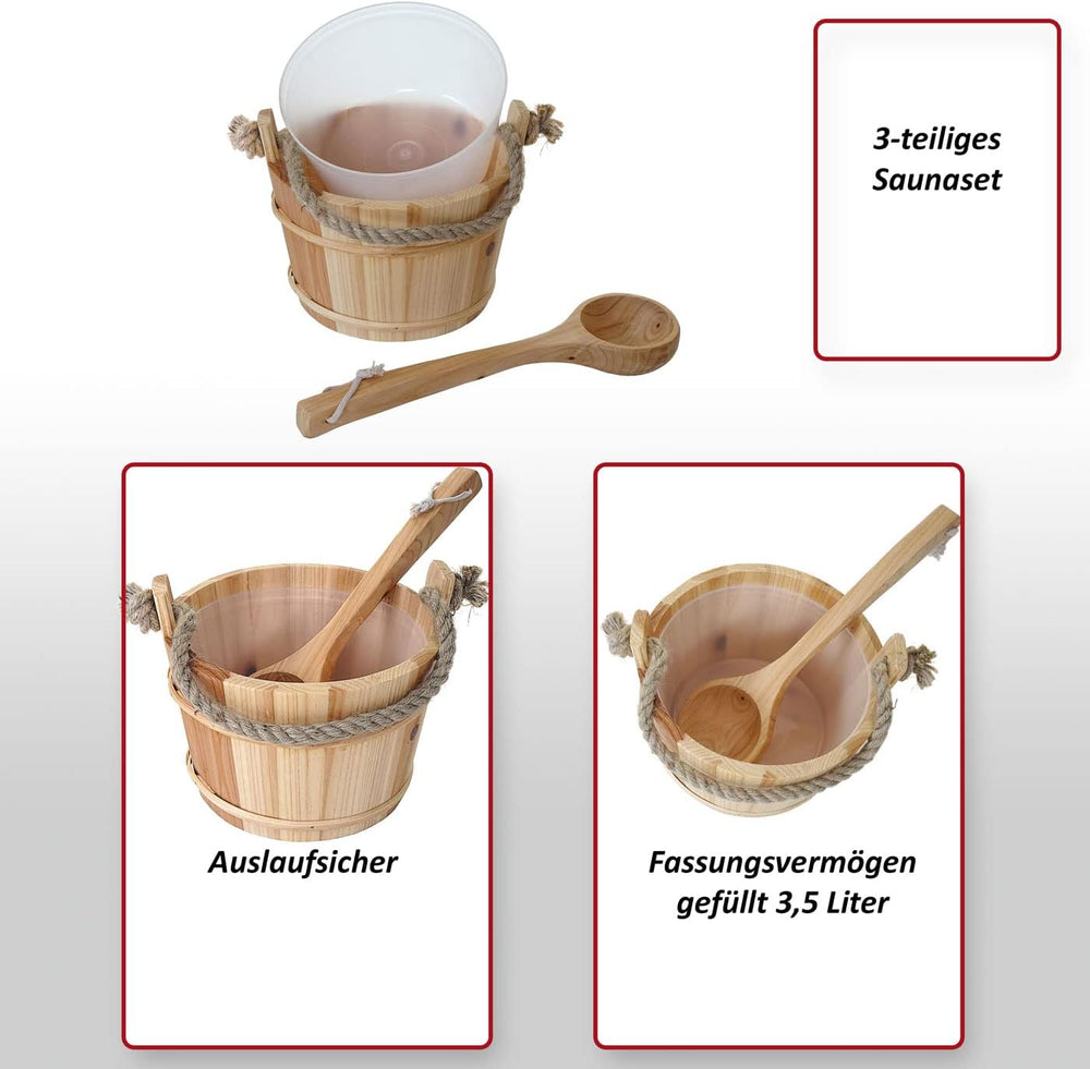 - Lieferumfang: 1x Kübel, 1x Einsatz, 1x Kelle | Auslaufsicher | 3-teiliges Saunaset | Fassungsvermögen gefüllt 3,5 Liter | Kübel und Kelle inkl. Aufhängeseil | Material Kübel und Kelle: Kieferholz | Material Einsatz: Kunststoff | Natürlicher Look