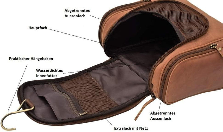- Mit dem Haken kann der Kulturbeutel problemlos im Badezimmer bzw. Schlafzimmer aufgehängt werden.