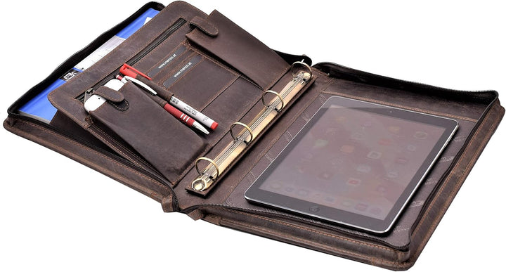 - Clever gestaltete Ringbuchmappe aus echten Büffelleder bietet Platz für Visitenkarten, Stifte, Tablet Unterlagen, Smartphone, Taschenrechner und vieles mehr.